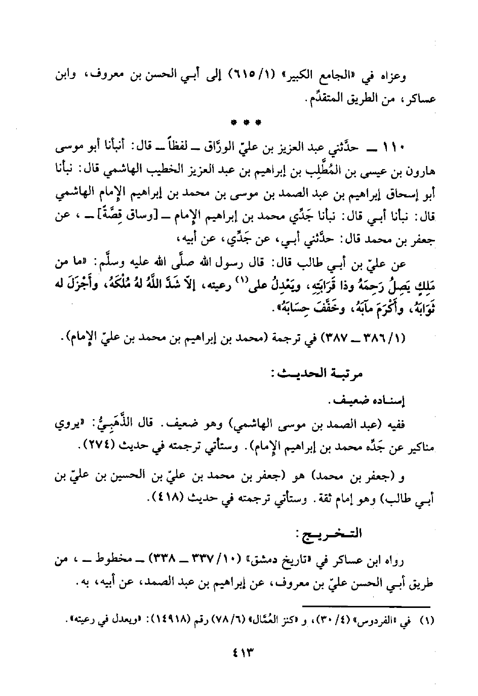 ١١٠ - حدَّثني عبد العزيز بن علي الورَّاق -لفظًا- قال: أنبأنا أبو موسى هارون بن عيسى بن المُطَّلِب بن إبراهيم بن عبد العزيز الخطيب الهاشمي قال: نبأنا أبو إسحاق إبراهيم بن عبد الصمد بن موسى بن محمد بن إبراهيم الإِمام الهاشمي قال: نبأنا أبي قال: نبأنا جَدِّي محمد بن إبراهيم الإِمام -[وساق قِصَّةً]-، عن جعفر بن محمد قال: حدَّثني أبي، عن جَدِّي، عن أبيه،