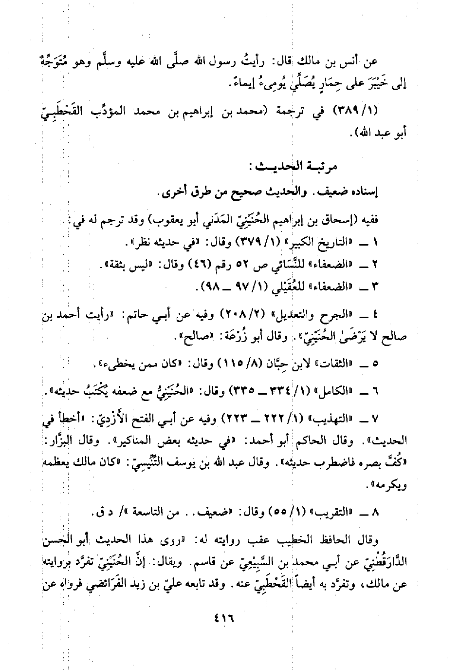 ٦ - "الكامل" (١/ ٣٣٤ - ٣٣٥) وقال: "الحُنَيْنِيُّ مع ضعفه يُكْتَبُ حديثه".