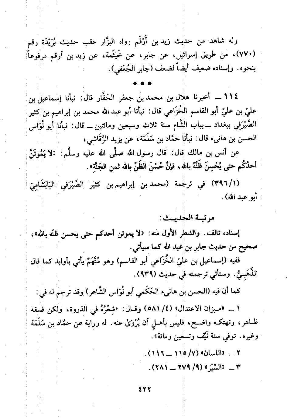 ١١٤ - أخبرنا هلال بن محمد بن جعفر الحَفَّار قال: نبأنا إسماعيل بن عليّ بن عليّ أبو القاسم الخُزَاعي قال: نبأنا أبو عبد اللَّه محمد بن إبراهيم بن كثير الصَّيْرَفِي ببغداد -بباب الشَّام سنة ثلاث وسبعين ومائتين- قال: نبأنا أبو نُوَاس الحسن بن هانئ قال: نبأنا حمَّاد بن سَلَمَة، عن يزيد الرَّقَاشي،