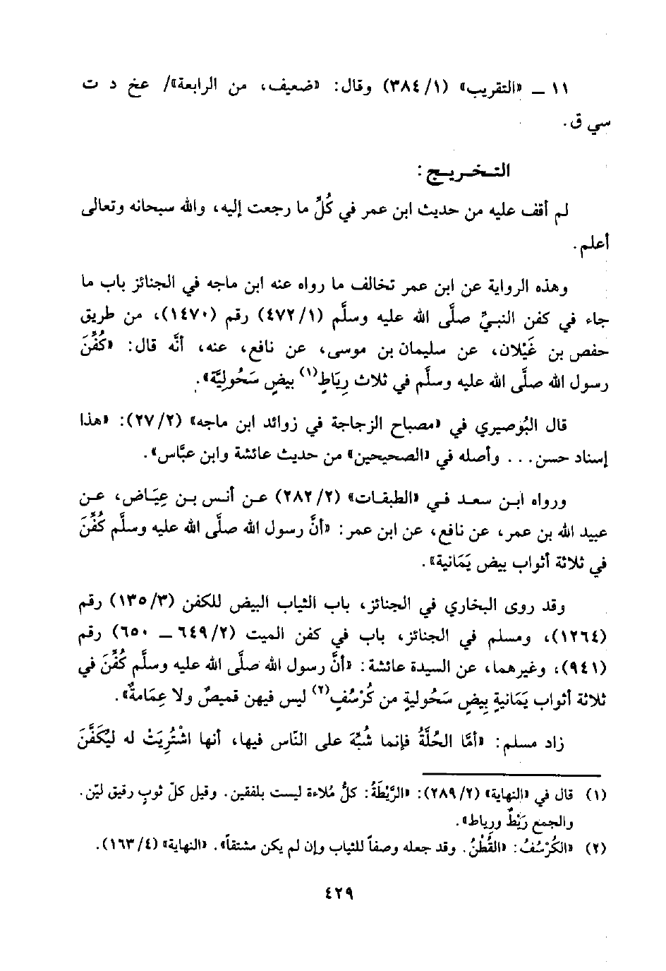وهذه الرواية عن ابن عمر تخالف ما رواه عنه ابن ماجه في الجنائز باب ما جاء في كفن النبيِّ صلَّى اللَّه عليه وسلَّم (١/ ٤٧٢) رقم (١٤٧٠)، من طريق حفص بن غَيْلان، عن سليمان بن موسى، عن نافع، عنه، أنَّه قال: "كُفِّنَ رسول اللَّه صلَّى اللَّه عليه وسلَّم في ثلاث رِيَاطٍ (¬١) بيضٍ سَحُوِليَّة".