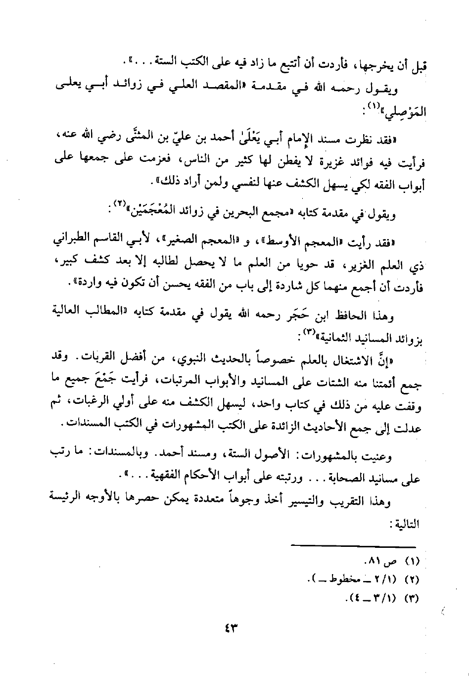 "إنَّ الاشتغال بالعلم خصوصًا بالحديث النبوي، من أفضل القربات. وقد جمع أئمتنا منه الشتات على المسانيد والأبواب المرتبات، فرأيت جَمْعَ جميع ما وقفت عليه من ذلك في كتاب واحد، ليسهل الكشف منه على أولي الرغبات، ثم عدلت إلى جمع الأحاديث الزائدة على الكتب المشهورات في الكتب المسندات.