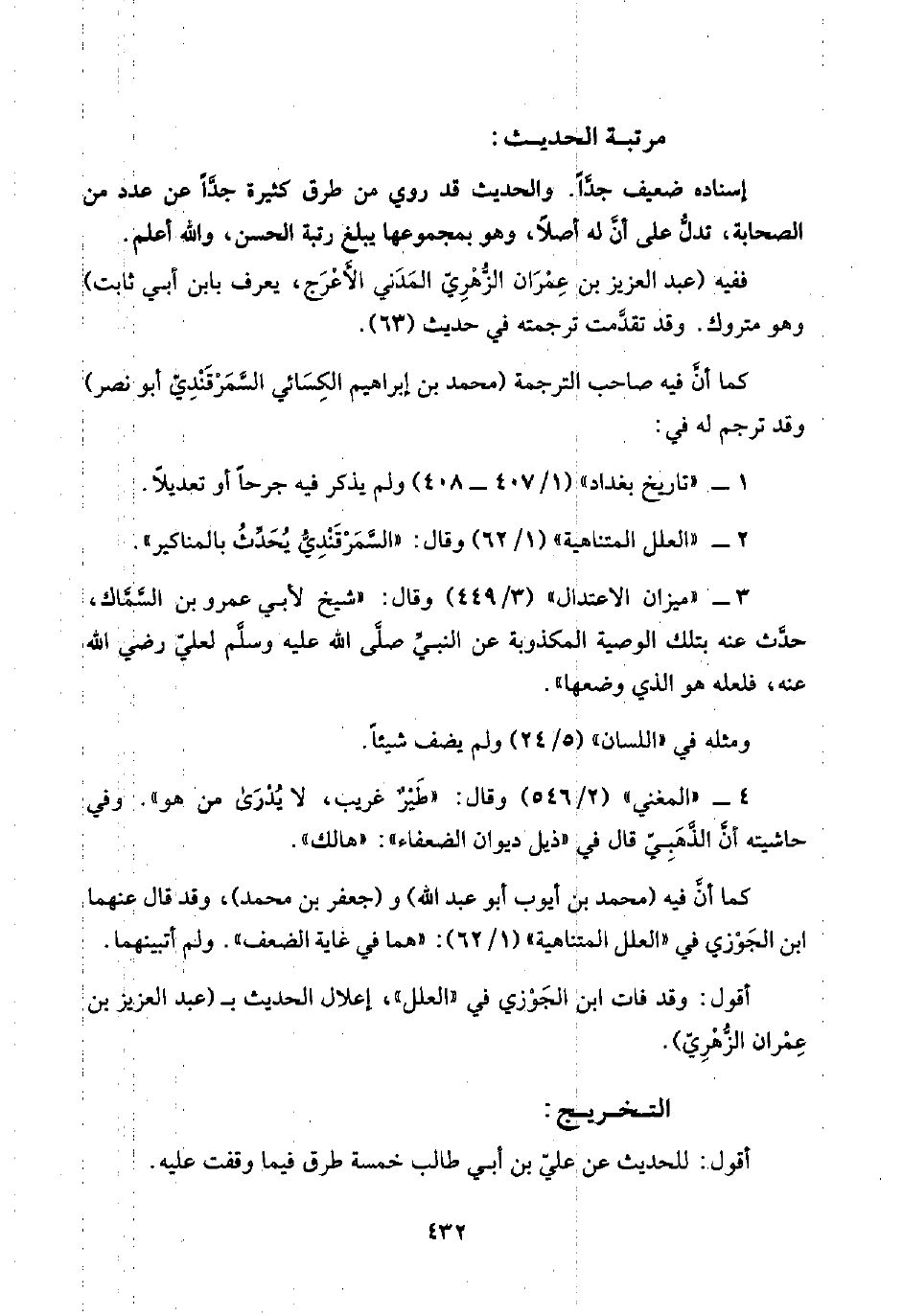 ٣ - "ميزان الاعتدال" (٣/ ٤٤٩) وقال: شيخ لأبي عمرو بن السَّمَّاك، حدَّث عنه بتلك الوصية المكذوبة عن النبيِّ صلَّى اللَّه عليه وسلَّم لعليّ رضي اللَّه عنه، فلعله هو الذي وضعها".