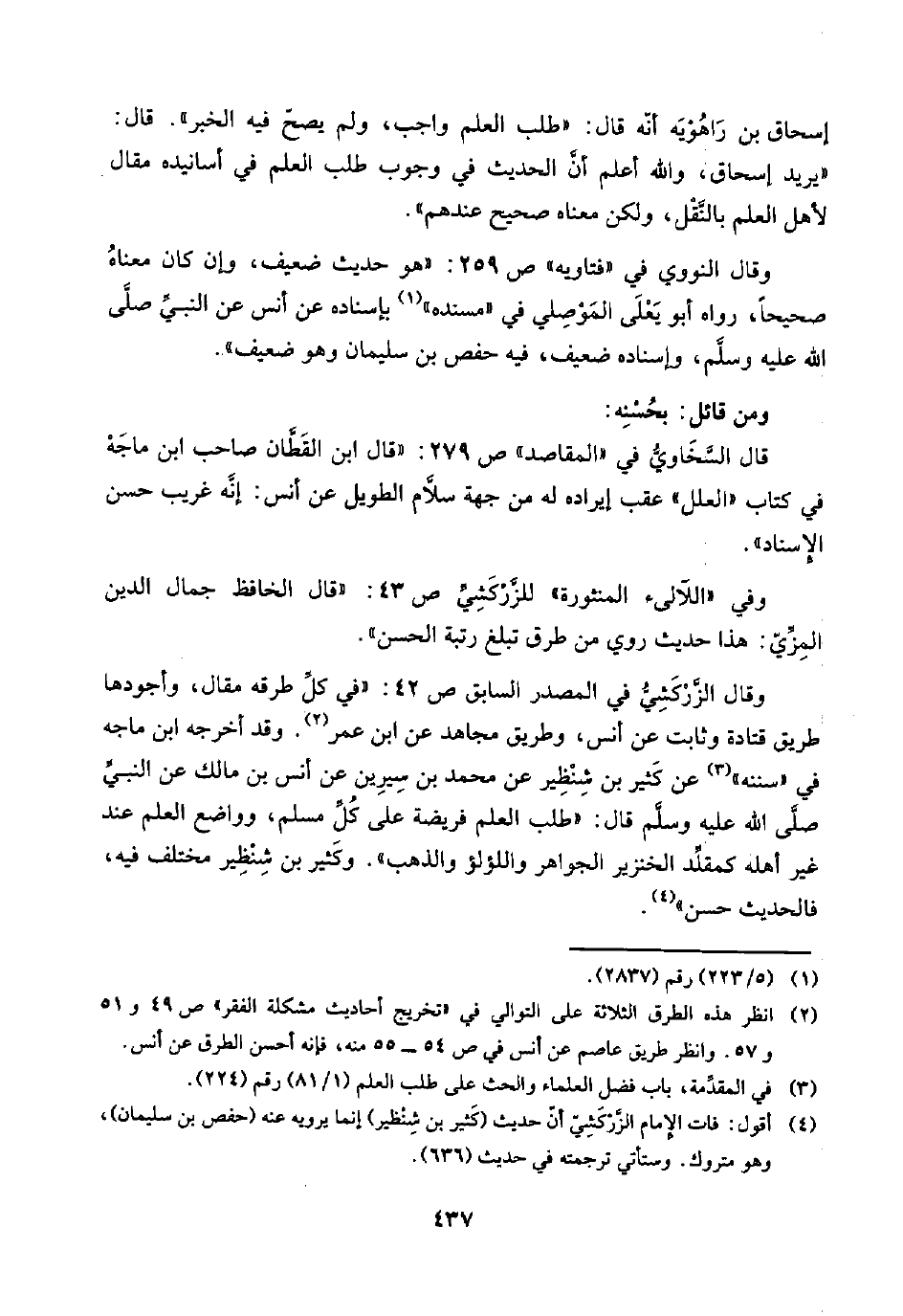 إسحاق بن رَاهُوْيَه أنّه قال: "طلب العلم واجب، ولم يصحّ فيه الخبر". قال: "يريد إسحاق، واللَّه أعلم أنَّ الحديث في وجوب طلب العلم في أسانيده مقال لأهل العلم بالنَّقْل، ولكن معناه صحيح عندهم".