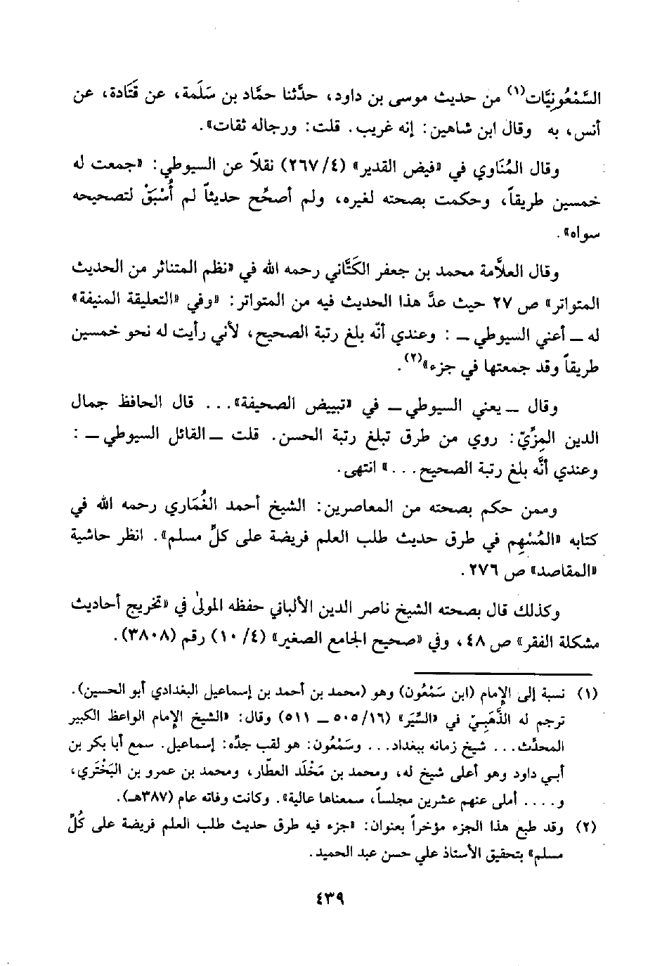 وممن حكم بصحته من المعاصرين: الشيخ أحمد الغُمَاري رحمه اللَّه في كتابه "المُسْهِم في طرق حديث طلب العلم فريضة على كلِّ مسلم". انظر حاشية "المقاصد" ص ٢٧٦.