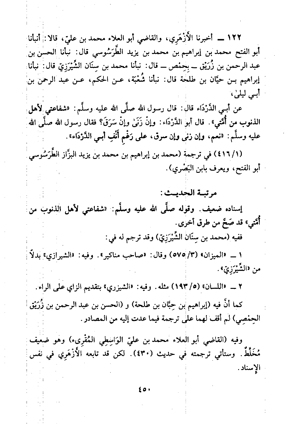 ١٢٢ - أخبرنا الأَزْهَرِي، والقاضي أبو العلاء محمد بن عليّ، قالا: أنبأنا أبو الفتح محمد بن إبراهيم بن محمد بن يزيد الطَّرَسُوسي قال: نبأنا الحسن بن عبد الرحمن بن زُرَيْق -بِحِمْص- قال: نبأنا محمد بن سِنَان الشِّيْرَزِيّ قال: نبأنا إبراهيم بن حيَّان بن طلحة قال: نبأنا شُعْبَة، عن الحكم، عن عبد الرحمن بن أبي ليلى،