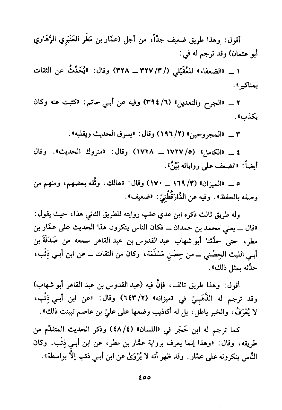 ٤ - "الكامل" (٥/ ١٧٢٧ - ١٧٢٨) وقال: "متروك الحديث". وقال أيضًا: "الضعف على رواياته بَيِّنٌ".