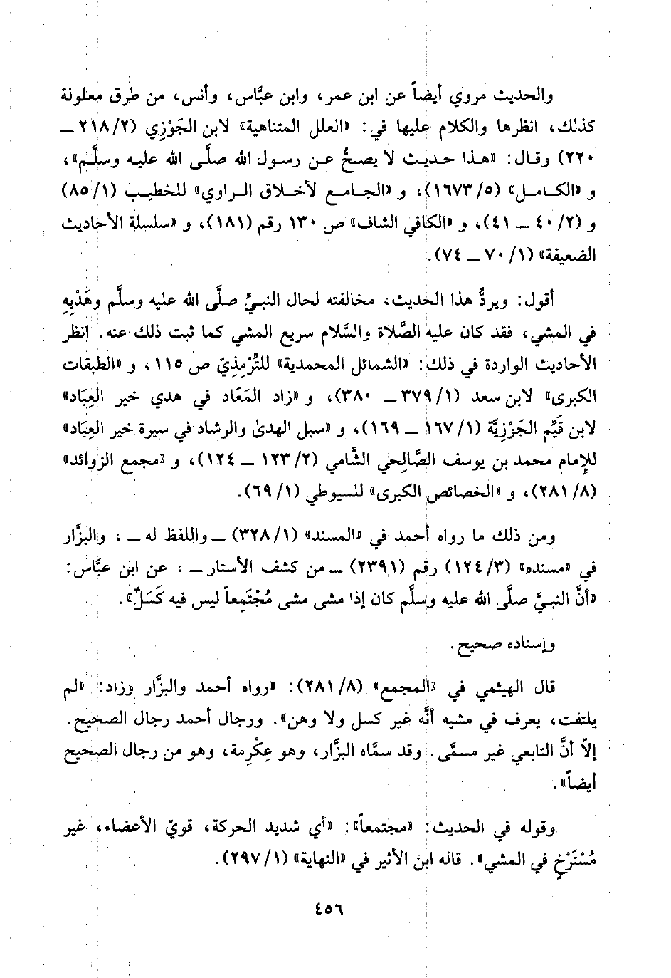 ومن ذلك ما رواه أحمد في "المسند" (١/ ٣٢٨) -واللفظ له-، والبزَّار في "مسنده" (٣/ ١٢٤) رقم (٢٣٩١) -من كشف الأستار-، عن ابن عبَّاس: "أنَّ النبيَّ صلَّى اللَّه عليه وسلَّم كان إذا مشى مشى مُجْتَمِعًا ليس فيه كَسَلٌ".