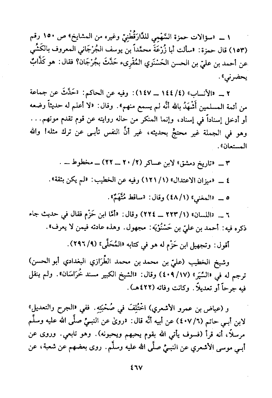 ٢ - "الأنساب" (٤/ ١٤٤ - ١٤٧): وفيه عن الحاكم: "حَدَّث عن جماعة من أئمة المسلمين أَشْهَدُ باللَّه أنَّه لم يسمع منهم". وقال: "لا أعلم له حديثًا وضعه أو أدخل إسنادًا في إسناد، وإنما المنكر من حاله روايته عن قوم تقدم موتهم. . . وهو في الجملة غير محتجٍّ بحديثه، غير أنَّ النفس تأبي عن ترك مثله! واللَّه المستعان".