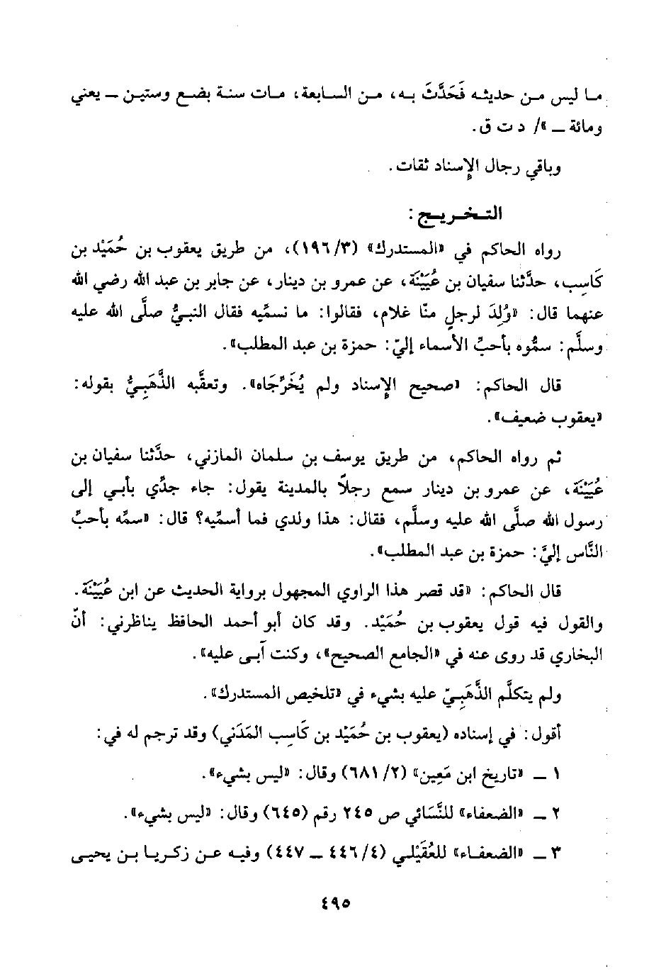 ثم رواه الحاكم، من طريق يوسف بن سلمان المازني، حدَّثنا سفيان بن عُيَيْنَة، عن عمرو بن دينار سمع رجلًا بالمدينة يقول: جاء جدِّي بأبي إلى رسول اللَّه صلَّى اللَّه عليه وسلَّم، فقال: هذا ولدي فما أسمِّيه؟ قال: "سمِّه بأحبِّ النَّاس إليَّ: حمزة بن عبد المطلب".
