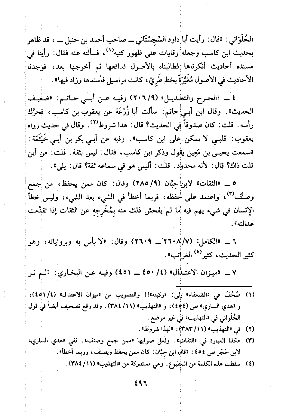 الحُلْوَاني: "قال: رأيت أبا داود السِّجِسْتَانِيّ -صاحب أحمد بن حنبل-، قد ظاهر بحديث ابن كاسب وجعله وقايات على ظهور كتبه (¬١)، فسألته عنه فقال: رأينا في مسنده أحاديث أنكرناها فطالبناه بالأصول فدافعها ثم أخرجها بعد، فوجدنا الأحاديث في الأصول مُغَيَّرَةً بخط طَرِيّ، كانت مراسيل فأسندها وزاد فيها".