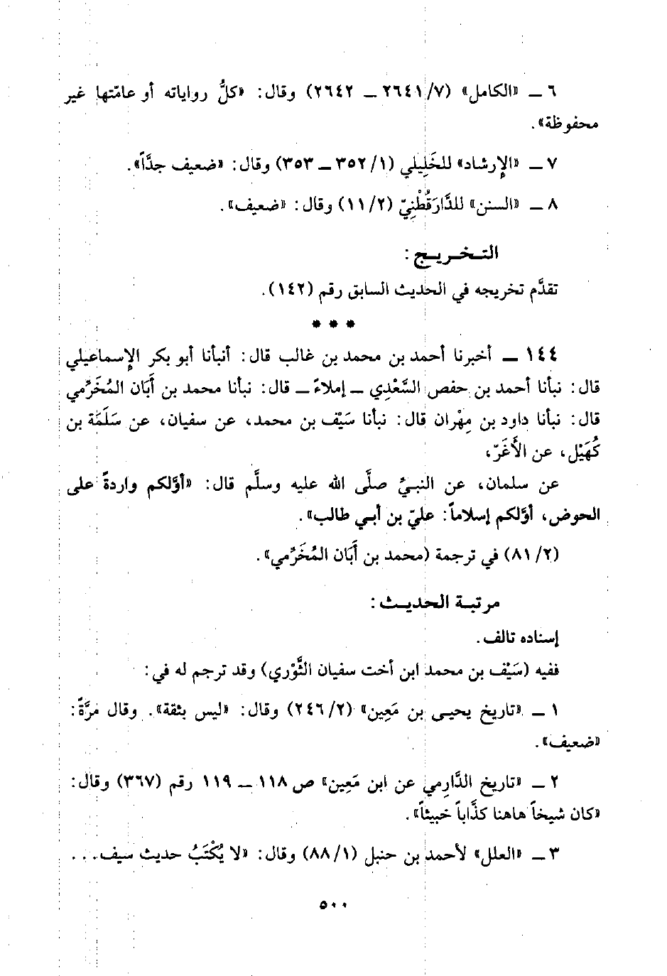 ١٤٤ - أخبرنا أحمد بن محمد بن غالب قال: أنبأنا أبو بكر الإسماعيلي قال: نبأنا أحمد بن حفص: السَّعْدِي -إملاءً- قال: نبأنا محمد بن أَبَان المُخَرِّمي قال: نبأنا داود بن مِهْران قال: نبأنا سَيْف بن محمد، عن سفيان، عن سَلَمَة بن كُهَيْل، عن الأَغَرّ،