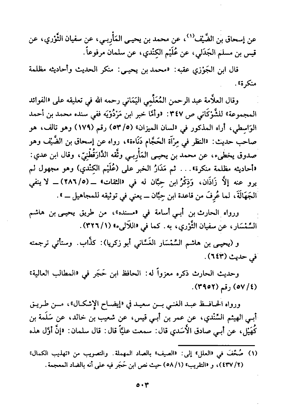 وقال العلَّامة عبد الرحمن المُعَلِّمِي اليَمَاني رحمه اللَّه في تعليقه على "الفوائد المجموعة" للشَّوْكَاني ص ٣٤٧: "وأمَّا خبر ابن مَرْدُوْيَه ففي سنده محمد بن أحمد الوَاسِطي، أراه المذكور في "لسان الميزان" (٥/ ٥٣) رقم (١٧٩) وهو تالف، هو صاحب حديث: "النظر في مِرْآة الحَجَّام دَنَاءة"، رواه عن إسحاق بن الضَّيْق وهو صدوق يخطئ، عن محمد بن يحيى المَأْرِبي وثقه الدَّارَقُطنِيّ، وقال ابن عدي: "أحاديثه مظلمة منكرة". . . ثم مَدَارُ الخبر على (عُلَيْم الكِنْدي) وهو مجهول لم يرو عنه إلّا زَاذَان، وَذِكْرُ ابن حِبَّان له في "الثقات" - (٥/ ٢٨٦) - لا ينفي الجَهَالَةَ، لما عُرِفَ من قاعدة ابن حِبَّان -يعني في توثيقه للمجاهيل-".