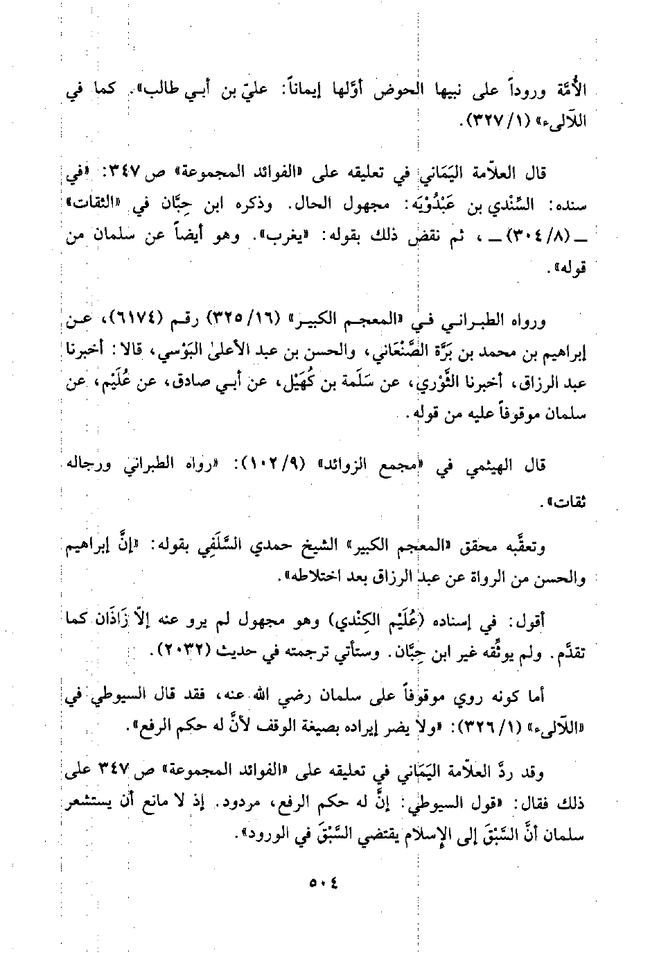 وقد ردَّ العلّامة اليَمَاني في تعليقه على "الفوائد المجموعة" ص ٣٤٧ على ذلك فقال: "قول السيوطي: إنَّ له حكم الرفع، مردود. إذ لا مانع أن يستشعر سلمان أنَّ السَّبْقَ إلى الإسلام يقتضي السَّبْقَ في الورود".