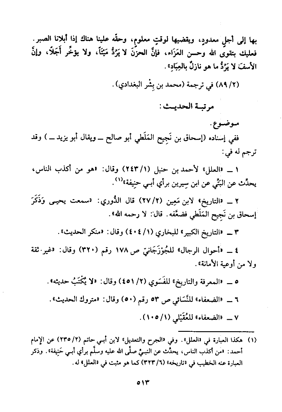 ٢ - "التاريخ" لابن مَعِين (٢/ ٢٧) قال الدُّوري: "سمعت يحيى وَذَكَرَ إسحاق بن نَجِيح المَلَطي فضعَّفه. قال: لا رحمه اللَّه".