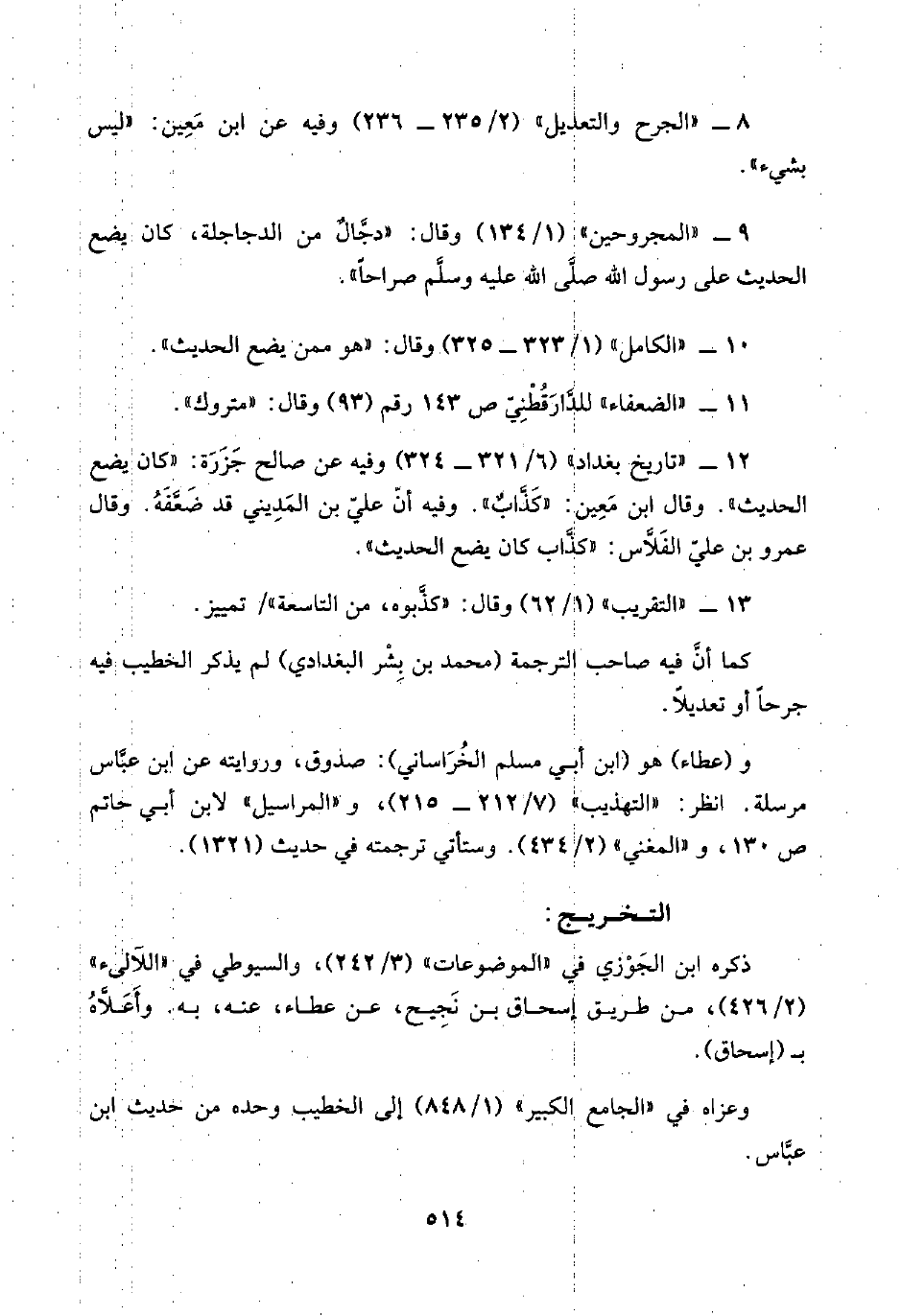 ١٢ - "تاريخ بغداد" (٦/ ٣٢١ - ٣٢٤) وفيه عن صالح جَزرَة: "كان يضع الحديث". وقال ابن مَعِين: "كَذَّابٌ". وفيه أنّ عليّ بن المَدِيني قد ضَعَّفَهُ. وقال عمرو بن عليّ الفلَّاس: "كذَّاب كان يضع الحديث".
