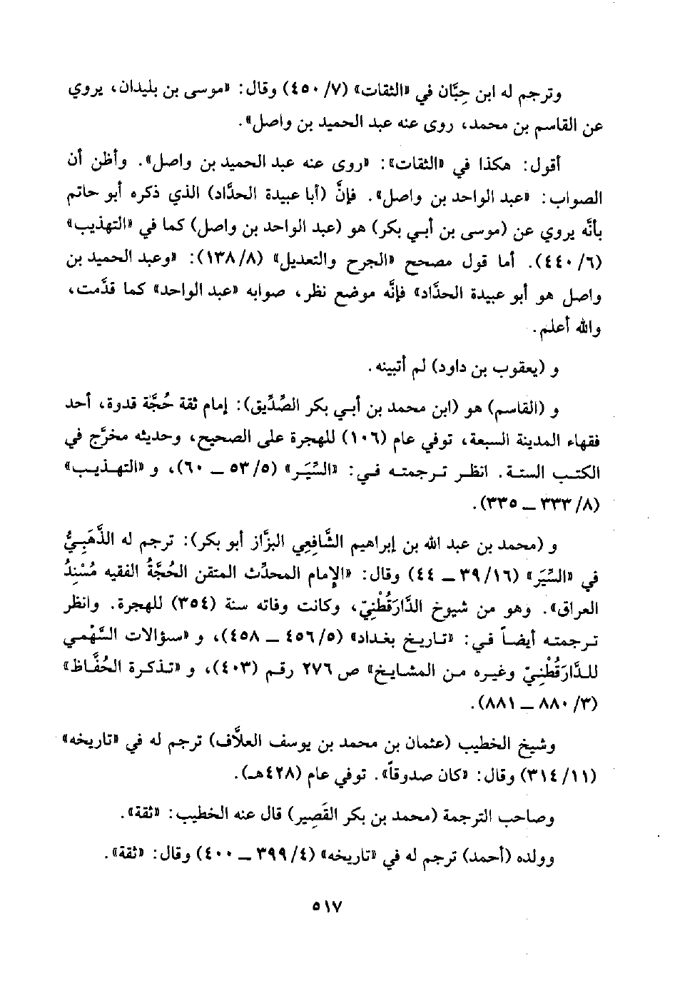 أقول: هكذا في "الثقات": "روى عنه عبد الحميد بن واصل". وأظن أن الصواب: "عبد الواحد بن واصل". فإنَّ (أبا عبيدة الحدَّاد) الذي ذكره أبو حاتم بأنَّه يروي عن (موسى بن أبي بكر) هو (عبد الواحد بن واصل) كما في "التهذيب" (٦/ ٤٤٠). أما قول مصحح "الجرح والتعديل" (٨/ ١٣٨): "وعبد الحميد بن واصل هو أبو عبيدة الحدَّاد، فإنَّه موضع نظر، صوابه "عبد الواحد" كما قدَّمت، واللَّه أعلم.