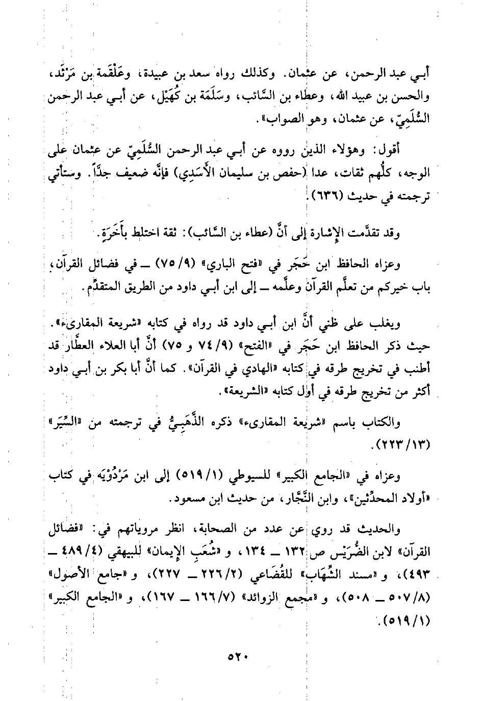 ويغلب على ظني أنَّ ابن أبي داود قد رواه في كتابه "شريعة المقارئ". حيث ذكر الحافظ ابن حَجَر في "الفتح" (٩/ ٧٤ و ٧٥) أنَّ أبا العلاء العطَّار قد أطنب في تخريج طرقه في كتابه "الهادي في القرآن". كما أنَّ أبا بكر بن أبي داود أكثر من تخريج طرقه في أول كتابه "الشريعة".