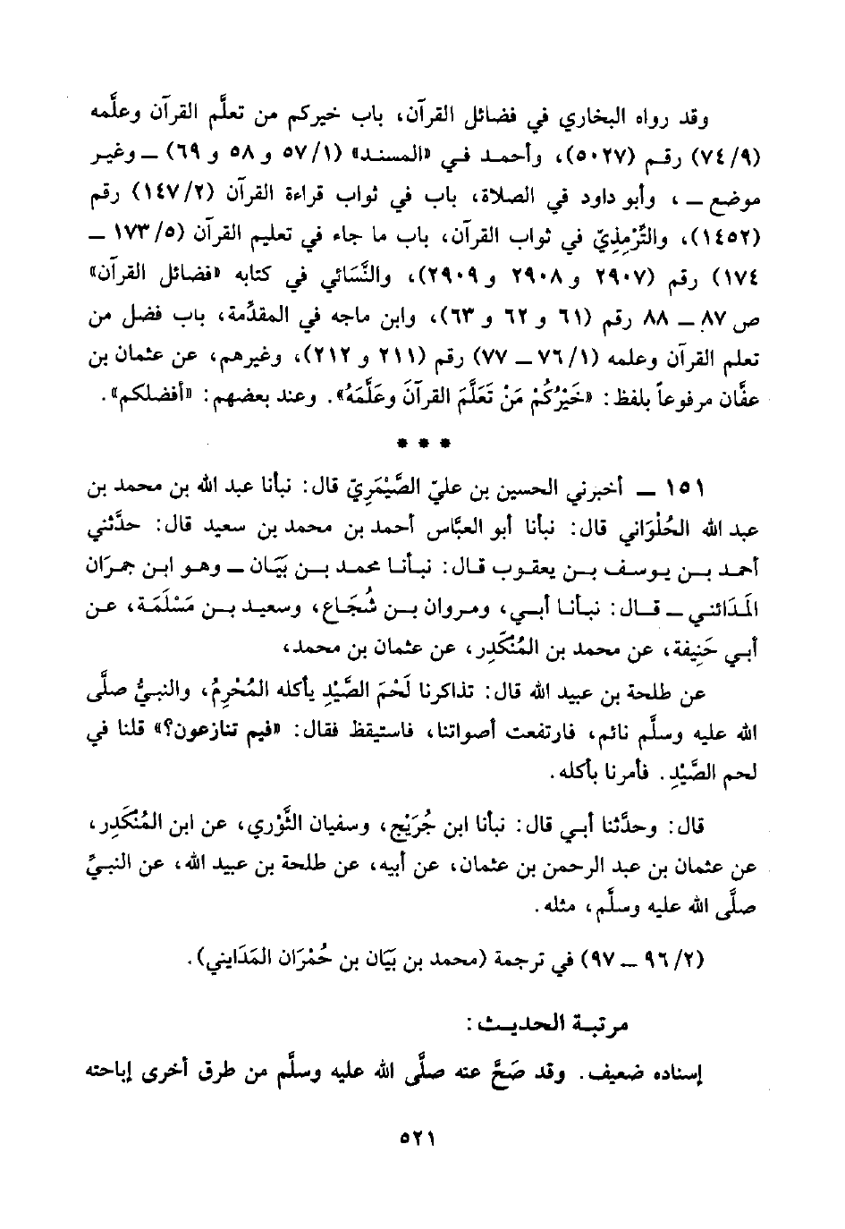 وقد رواه البخاري في فضائل القرآن، باب خيركم من تعلَّم القرآن وعلَّمه (٩/ ٧٤) رقم (٥٠٢٧)، وأحمد في "المسند" (١/ ٥٧ و ٥٨ و ٦٩) -وغير موضع-، وأبو داود في الصلاة، باب في ثواب قراءة القرآن (٢/ ١٤٧) رقم (١٤٥٢)، والترمذي في ثواب القرآن، باب ما جاء في تعليم القرآن (٥/ ١٧٣ - ١٧٤) رقم (٢٩٠٧ و ٢٩٠٨ و ٢٩٠٩)، والنَّسَائي في كتابه "فضائل القرآن" ص ٨٧ - ٨٨ رقم (٦١ و ٦٢ و ٦٣)، وابن ماجه في المقدِّمة، باب فضل من تعلم القرآن وعلمه (١/ ٧٦ - ٧٧) رقم (٢١١ و ٢١٢)، وغيرهم، عن عثمان بن عفَّان مرفوعًا بلفظ: "خَيْرُكُمْ مَنْ تَعَلَّمَ القرآنَ وعَلَّمَهُ". وعند بعضهم: أفضلكم"