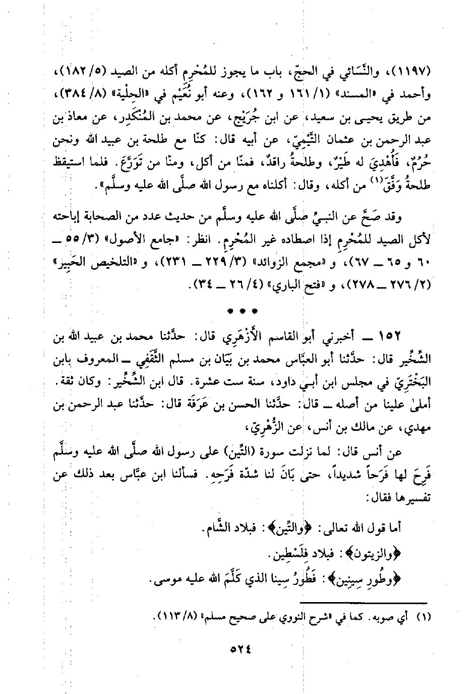 ١٥٢ - أخبرني أبو القاسم الأَزْهَرِي قال: حدَّثنا محمد بن عبيد اللَّه بن الشَّخِّير قال: حدَّثنا أبو العبَّاس محمد بن بَيَان بن مسلم الثَّقَفِيّ -المعروف بابن البَخْتَرِيّ في مجلس ابن أبي داود، سنة ست عشرة. قال ابن الشِّخِّير: وكان ثقة. أملي علينا من أصله- قال: حدَّثنا الحسن بن عَرَفَة قال: حدَّثنا عبد الرحمن بن مهدي، عن مالك بن أنس، عن الزُّهْرِيّ،