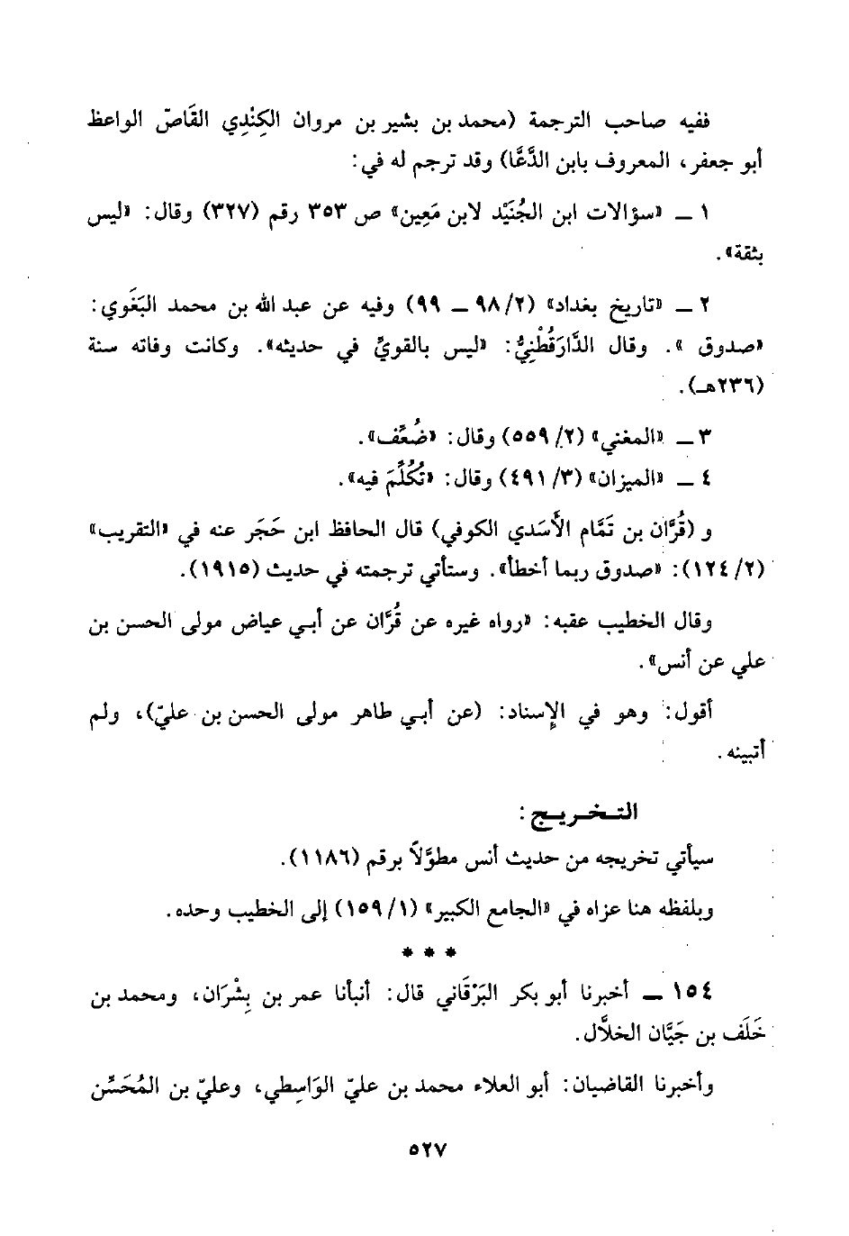 ٢ - "تاريخ بغداد" (٢/ ٩٨ - ٩٩) وفيه عن عبد اللَّه بن محمد البَغَوي: "صدوق". وقال الدَّارَقُطْنِيُّ: "ليس بالقويِّ في حديثه". وكانت وفاته سنة (٢٣٦ هـ).