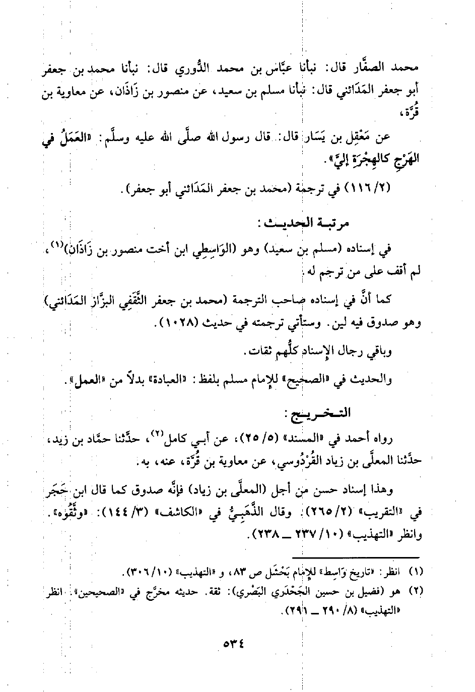 محمد الصفَّار قال: نبأنا عبَّاس بن محمد الدُّوري قال: نبأنا محمد بن جعفر أبو جعفر المَدَائني قال: نبأنا مسلم بن سعيد، عن منصور بن زَاذَان، عن معاوية بن قُرَّة،