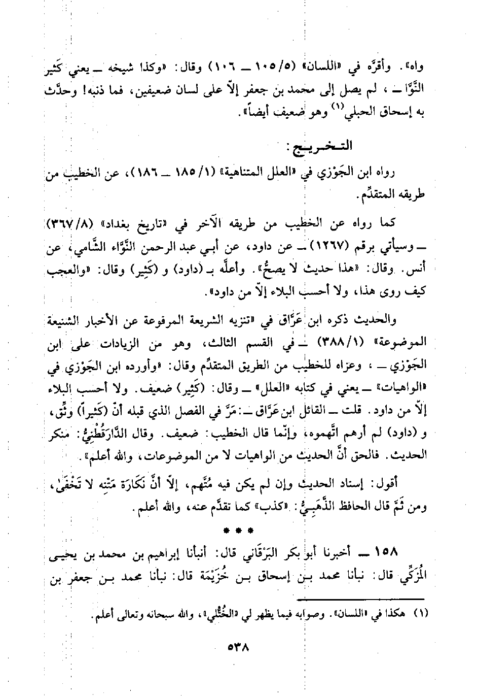 ١٥٨ - أخبرنا أبو بكر البَرْقَاني قال: أنبأنا إبراهيم بن محمد بن يحيى المُزَكِّي قال: نبأنا محمد بن إسحاق بن خُزَيْمَة قال: نبأنا محمد بن جعفر بن