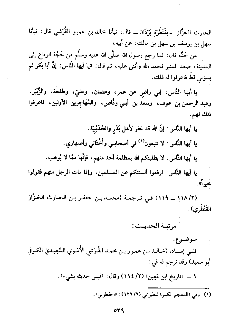 ففي إسناده (خالد بن عمرو بن محمد القُرَشي الأُمَوي السَّعِيديّ الكوفي أبو سعيد) وقد ترجم له في: