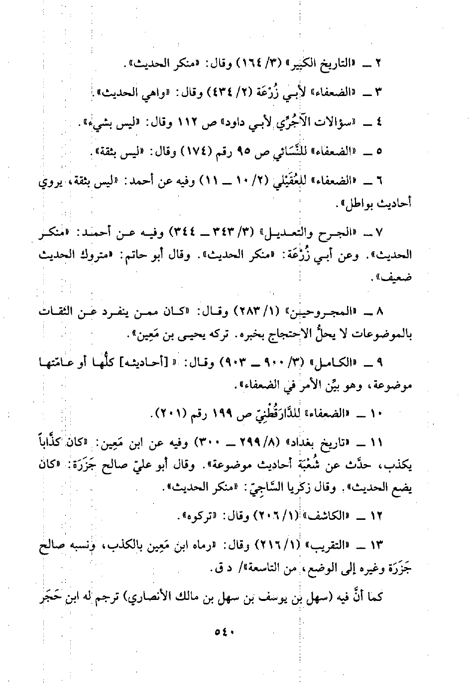 ٩ - "الكامل" (٣/ ٩٠٠ - ٩٠٣) وقال: " [أحاديثه] كلُّها أو عامّتها موضوعة، وهو بيِّن الأمر في الضعفاء".