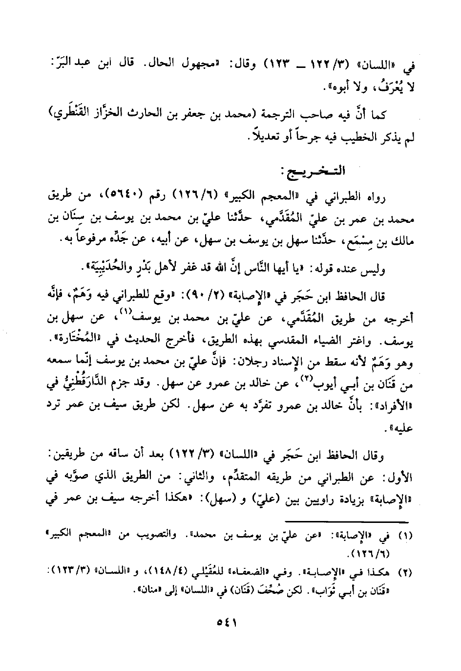وقال الحافظ ابن حَجَر في "اللسان" (٣/ ١٢٢) بعد أن ساقه من طريقين: الأول: عن الطبراني من طريقه المتقدِّم، والثاني: من الطريق الذي صوَّبه في "الإِصابة" بزيادة راويين بين (عليّ) و (سهل): "هكذا أخرجه سيف بن عمر في