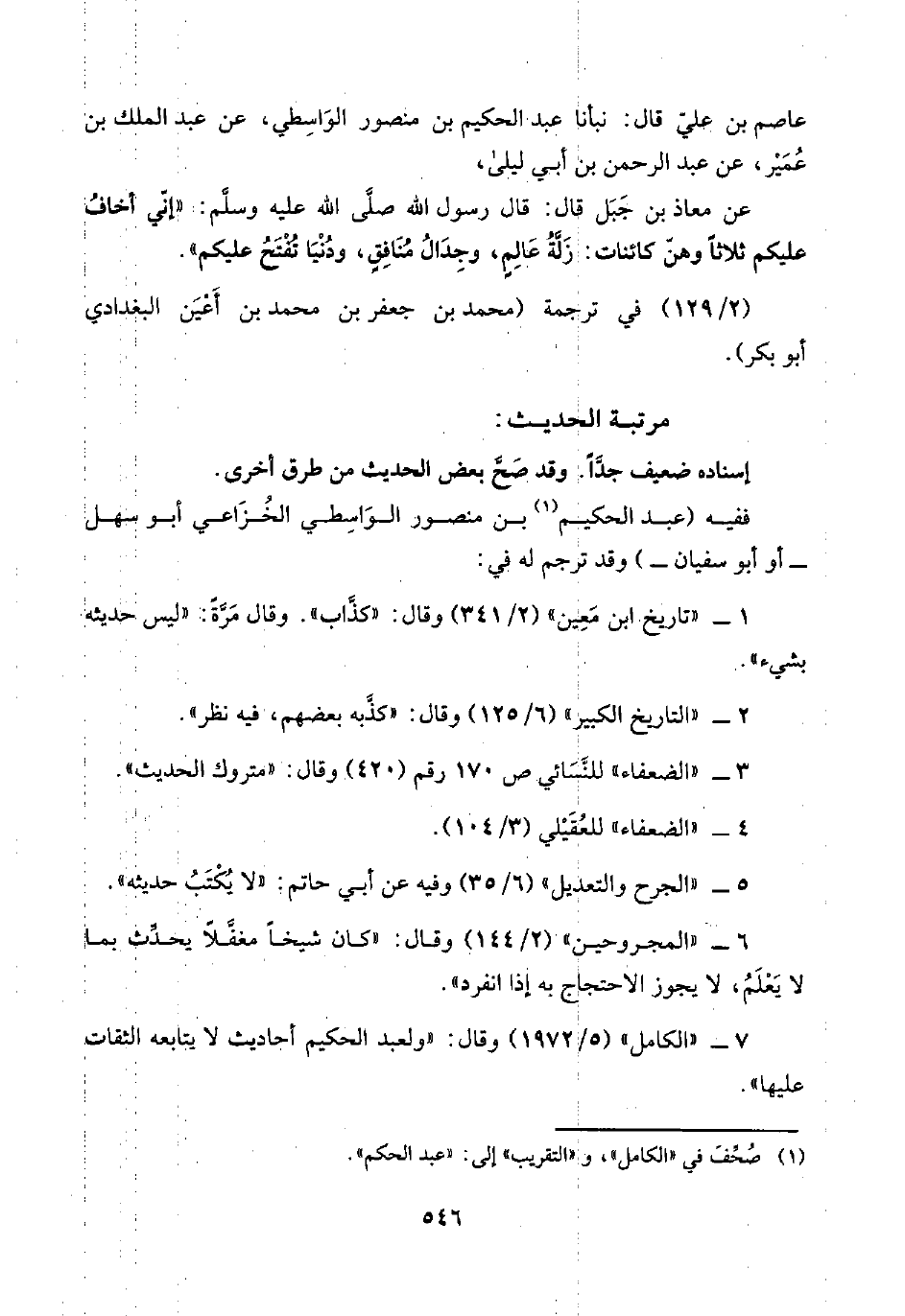 ٧ - "الكامل" (٥/ ١٩٧٢) وقال: "ولعبد الحكيم أحاديث لا يتابعه الثقات عليها".