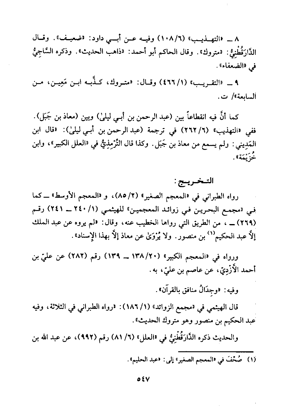 كما أنَّ فيه انقطاعًا بين (عبد الرحمن بن أبي ليلى) وبين (معاذ بن جَبَل). ففي "التهذيب" (٦/ ٢٦٢) في ترجمة (عبد الرحمن بن أبي ليلى): "قال ابن المَدِيني: ولم يسمع من معاذ بن جَبَل. وكذا قال التِّرْمِذِيُّ في "العلل الكبير"، وابن خُزَيْمَة".