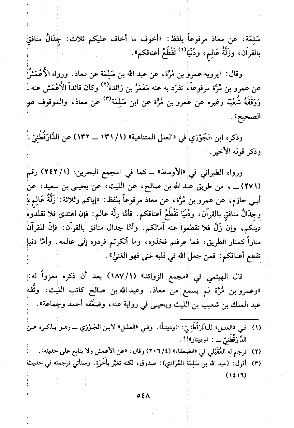 ورواه الطبراني في "الأوسط" -كما في "مجمع البحرين" (١/ ٢٤٢) رقم (٢٧١) -، من طريق عبد اللَّه بن صالح، عن الليث، عن يحيى بن سعيد، عن أبي حازم، عن عمرو بن مُرَّة، عن معاذ مرفوعًا بلفظ: "إياكم وثلاثة: زَلَّةُ عَالِمٍ، وجِدَالُ منافقٍ بالقرآن، ودُنْيَا تَقْطَعُ أعناقكم. فأمَّا زلَّة عالم: فإن اهتدى فلا تقلدوه دينكم، وإن زَلَّ فلا تقطعوا عنه آمالكم. وأمَّا جدال منافق بالقرآن: فإنّ للقرآن منارًا كمنار الطريق، فما عرفتم فخذوه، وما أنكرتم فردوه إلى عالمه. وأمَّا دنيا وتقطع أعناقكم: فمن جعل اللَّه في قلبه غنى فهو الغنيُّ".