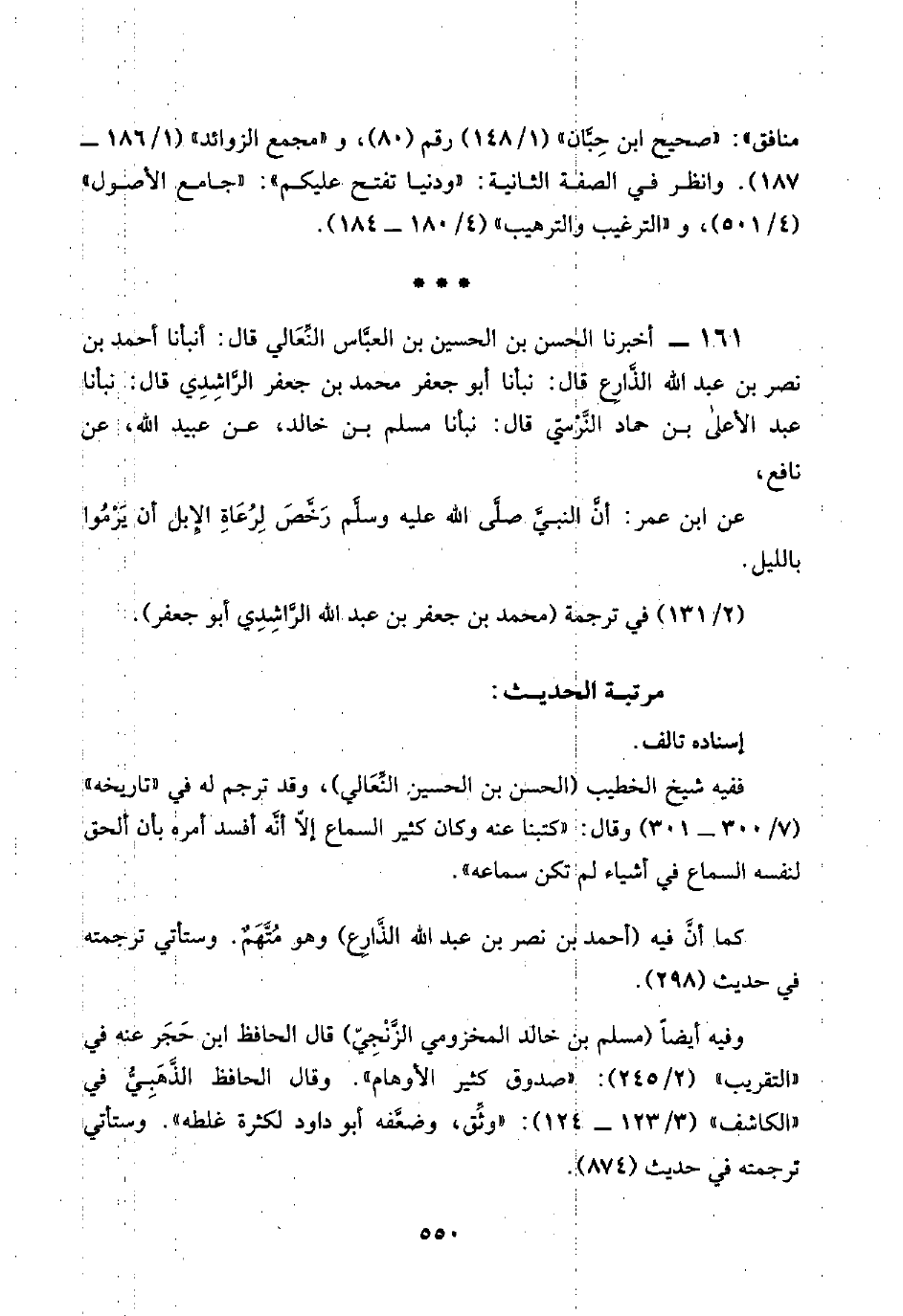 ١٦١ - أخبرنا الحسن بن الحسين بن العبَّاس النِّعَالي قال: أنبأنا أحمد بن نصر بن عبد اللَّه الذِّارِع قال: نبأنا أبو جعفر محمد بن جعفر الرَّاشِدِي قال: نبأنا عبد الأعلى بن حماد النَّرْسّي قال: نبأنا مسلم بن خالد، عن عبيد اللَّه، عن نافع،