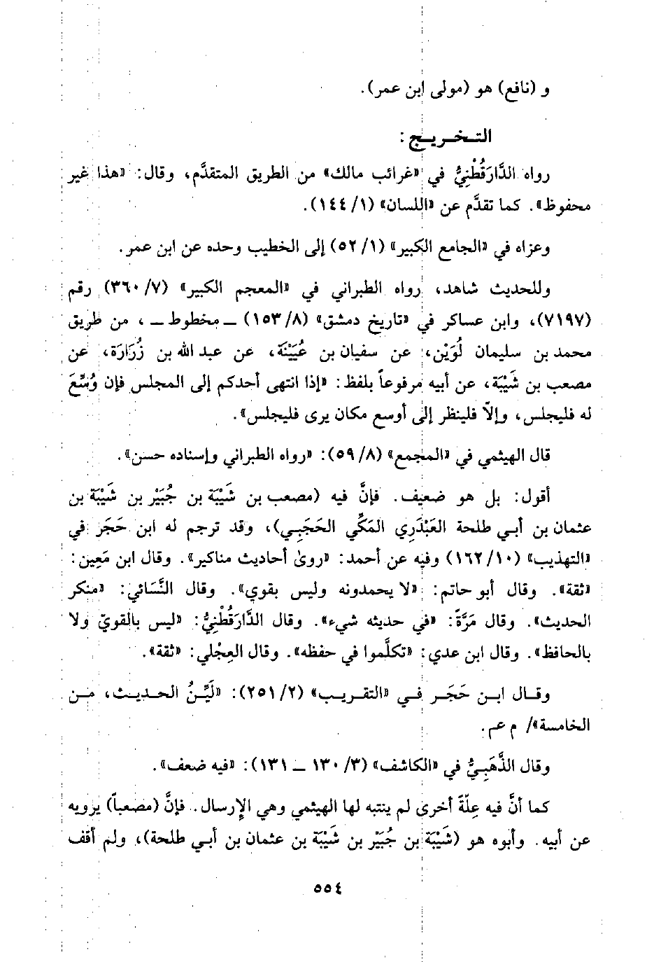 كما أنَّ فيه عِلّةً أخرى لم ينتبه لها الهيثمي وهي الإِرسال. فإنَّ (مصعبًا) يرويه عن أبيه. وأبوه هو (شَيْبَة بن جُبَيْر بن شَيْبَة بن عثمان بن أبي طلحة)، ولم أقف