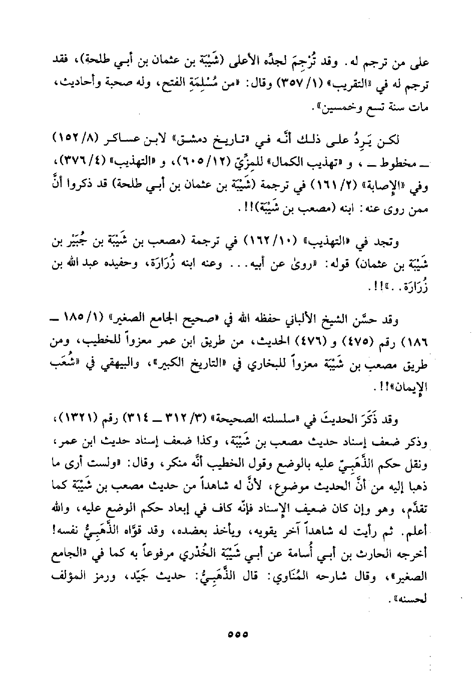 لكن يَرِدُ على ذلك أنَّه في "تاريخ دمشق" لابن عساكر (٨/ ١٥٢) -مخطوط-، و"تهذيب الكمال" للمِزِّيّ (١٢/ ٦٠٥)، و"التهذيب" (٤/ ٣٧٦)، وفي "الإِصابة" (٢/ ١٦١) في ترجمة (شَيْبَة بن عثمان بن أبي طلحة) قد ذكروا أنَّ ممن روى عنه: ابنه (مصعب بن شَيْبَة)! ! .