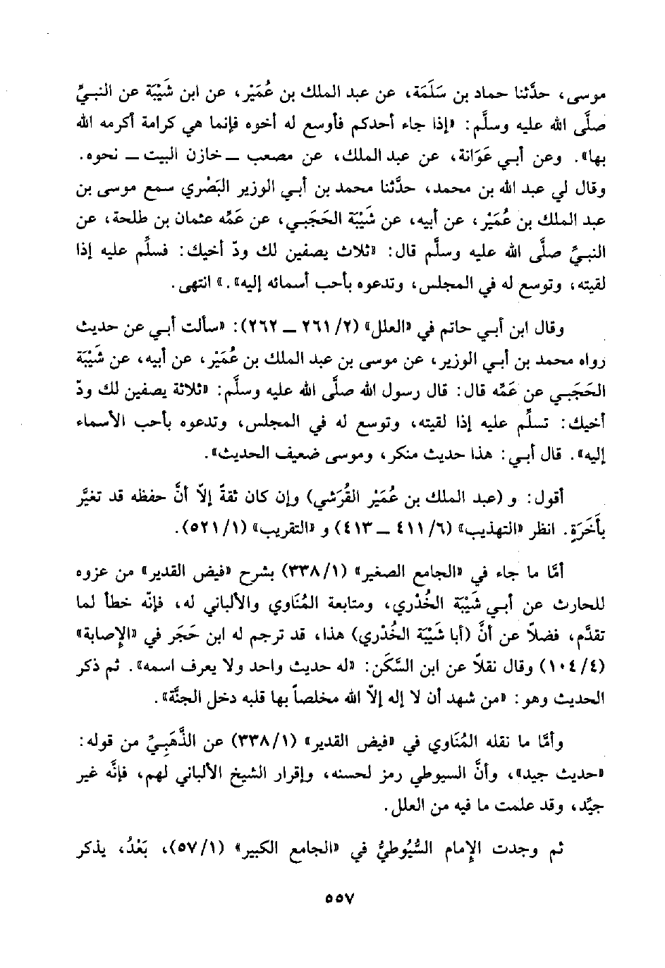 موسى، حدَّثنا حماد بن سَلَمَة، عن عبد الملك بن عُمَيْر، عن ابن شَيْبَة عن النبيِّ صلَّى اللَّه عليه وسلَّم: "إذا جاء أحدكم فأوسع له أخوه فإنما هي كرامة أكرمه اللَّه بها". وعن أبي عَوَانة، عن عبد الملك، عن مصعب -خازن البيت- نحوه. وقال لي عبد اللَّه بن محمد، حدَّثنا محمد بن أبي الوزير البَصْري سمع موسى بن عبد الملك بن عُمَير، عن أبيه، عن شَيْبَة الحَجَبي، عن عَمِّه عثمان بن طلحة، عن النبيِّ صلَّى اللَّه عليه وسلَّم قال: "ثلاث يصفين لك ودّ أخيك: فسلِّم عليه إذا لقيته، وتوسع له في المجلس، وتدعوه بأحب أسمائه إليه"." انتهى.