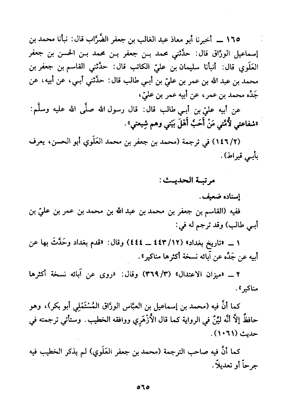 ١٦٥ - أخبرنا أبو معاذ عبد الغالب بن جعفر الضَّرَّاب قال: نبأنا محمد بن إسماعيل الورَّاق قال: حدَّثني محمد بن جعفر بن محمد بن الحسن بن جعفر العَلَوي قال: أنبأنا سليمان بن عليّ الكاتب قال: حدَّثني القاسم بن جعفر بن محمد بن عبد اللَّه بن عمر بن عليّ بن أبي طالب قال: حدَّثني أبي، عن أبيه، عن جَدِّه محمد بن عمر، عن أبيه عمر بن عليّ،