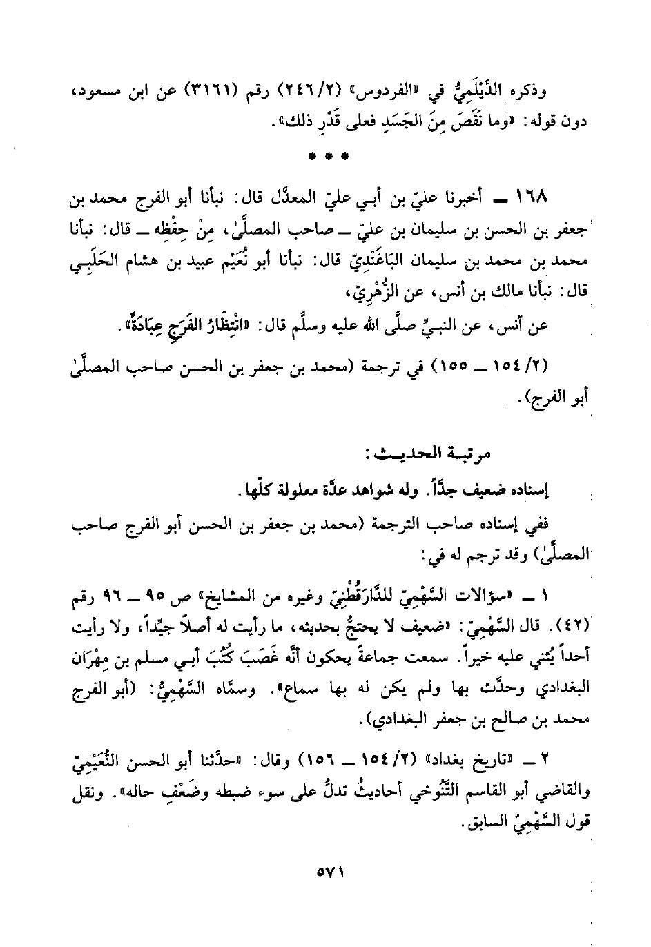 ٢ - "تاريخ بغداد" (٢/ ١٥٤ - ١٥٦) وقال: "حدَّثنا أبو الحسن النُّعَيْمِيّ والقاضي أبو القاسم التَّنُوخي أحاديثُ تدلُّ على سوء ضبطه وضَعْفِ حاله". ونقل قول السَّهْمِيّ السابق.