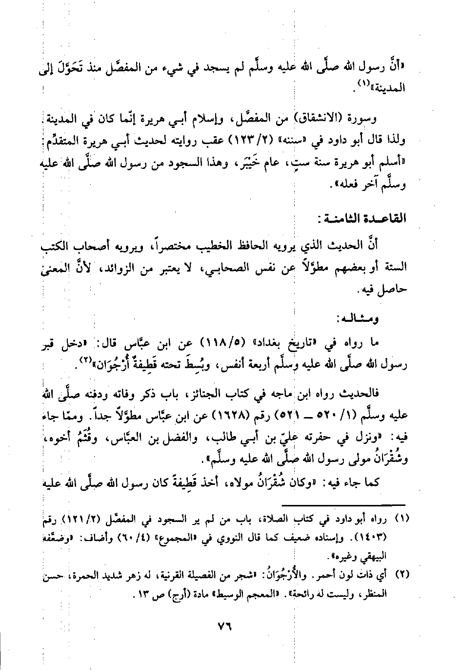 (¬١) رواه أبو داود في كتاب الصلاة، باب من لم ير السجود في المفصَّل (٢/ ١٢١) رقم (١٤٠٣). وإسناده ضعيف كما قال النووي في "المجموع" (٤/ ٦٠) وأضاف: "وضعَّفه البيهقي وغيره".