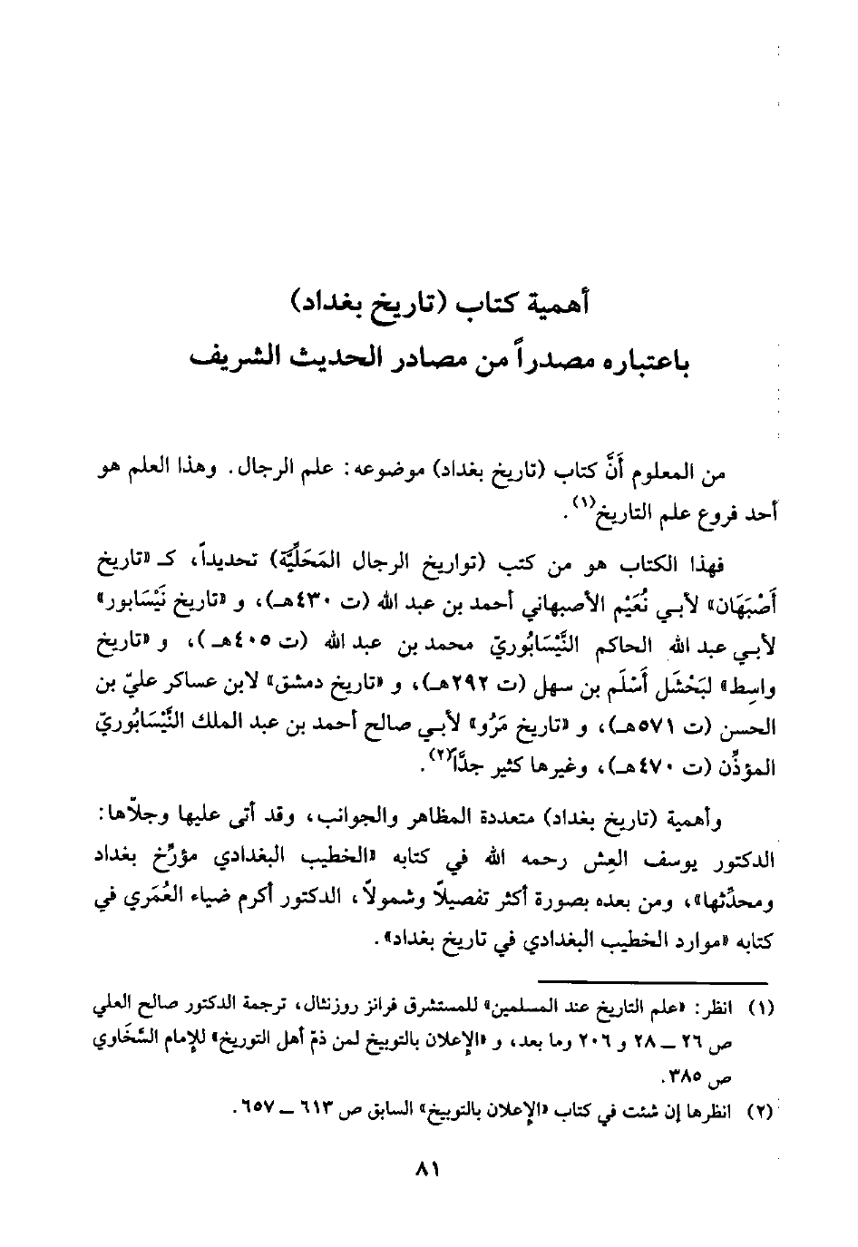 (¬١) انظر: "علم التاريخ عند المسلمين" للمستشرق فرانز روزنثال، ترجمة الدكتور صالح العلي ص ٢٦ - ٢٨ و ٢٠٦ وما بعد، و"الإعلان بالتوبيخ لمن ذمّ أهل التوريخ" للإمام السَّخَاوي ص ٣٨٥.
