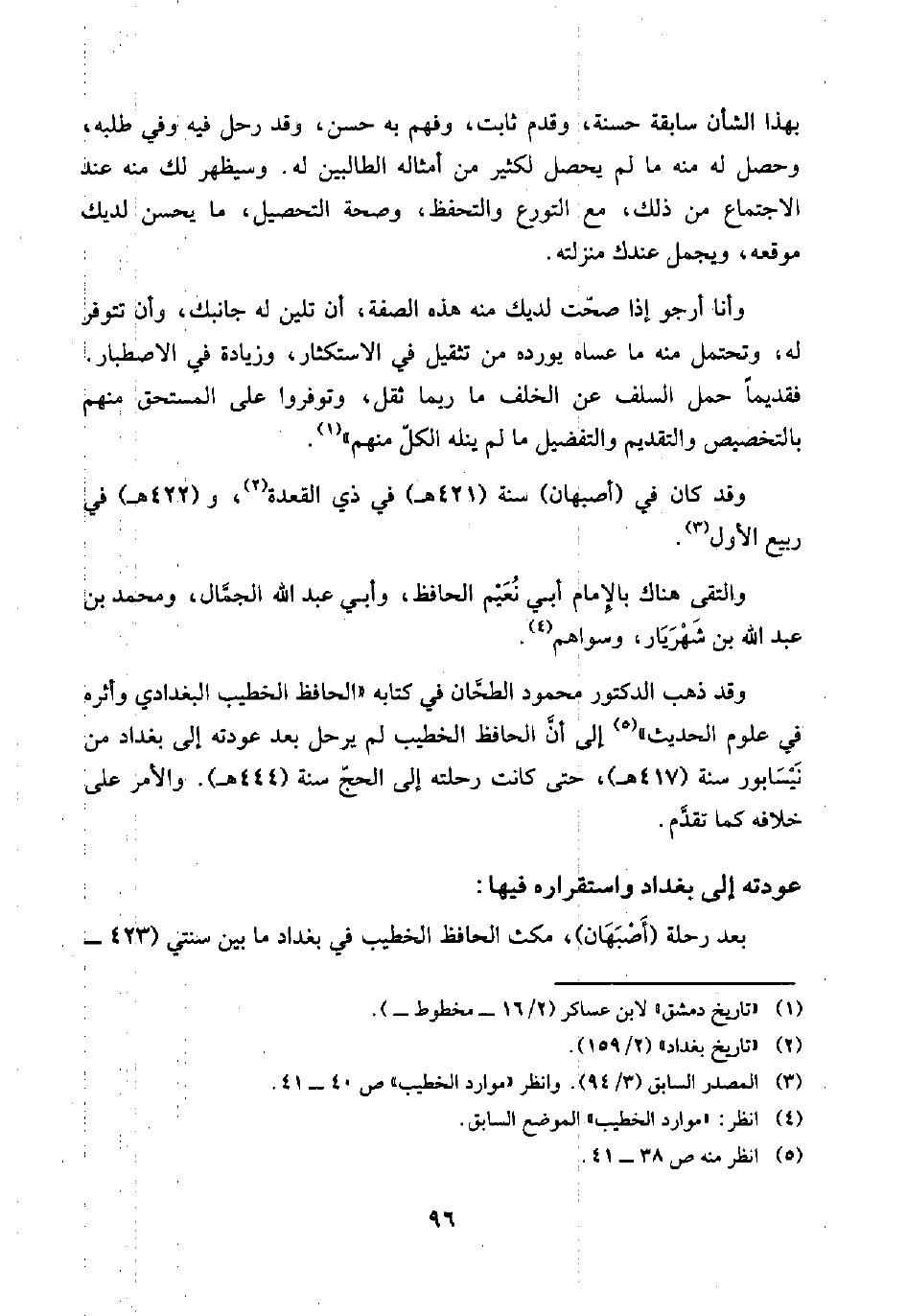 وقد ذهب الدكتور محمود الطحَّان في كتابه "الحافظ الخطيب البغدادي وأثره في علوم الحديث" (¬٥) إلى أنَّ الحافظ الخطيب لم يرحل بعد عودته إلى بغداد من نَيْسَابور سنة (٤١٧ هـ)، حتى كانت رحلته إلى الحجّ سنة (٤٤٤ هـ). والأمر على خلافه كما تقدَّم.