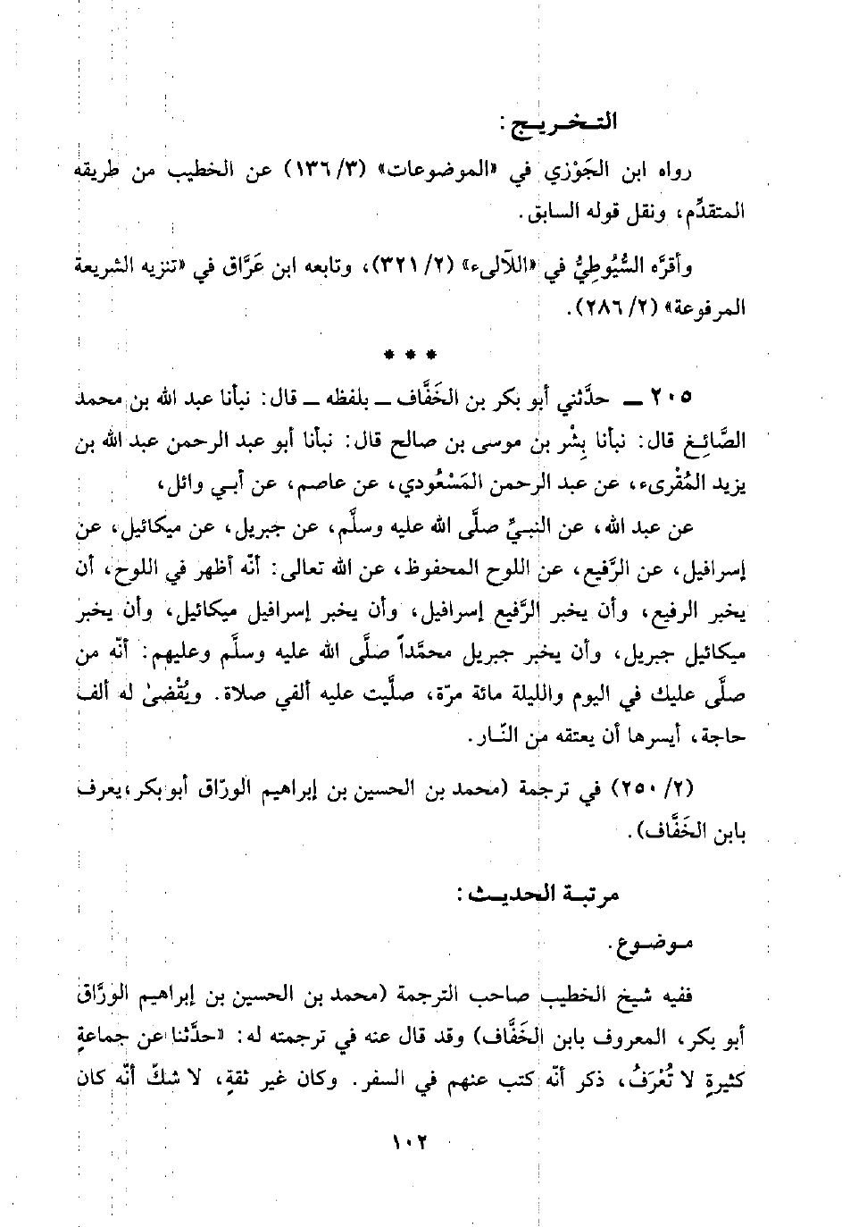 عن عبد اللَّه، عن النبيِّ صلَّى اللَّه عليه وسلَّم، عن جبريل، عن ميكائيل، عن إسرافيل، عن الرَّفيع، عن اللوح المحفوظ، عن اللَّه تعالى: أنّه أظهر في اللوح، أن يخير الرفيع، وأن يخبر الرَّفيع إسرافيل، وأن يخبر إسرافيل ميكائيل، وأن يخبر ميكائيل جبريل، وأن يخبر جبريل محمَّدًا صلَّى اللَّه عليه وسلَّم وعليهم: أنّه من صلَّى عليك في اليوم والليلة مائة مرَّة، صلَّيت عليه ألفي صلاة. ويُفْضى له ألف حاجة، أيسرها أن يعتقه من النّار.