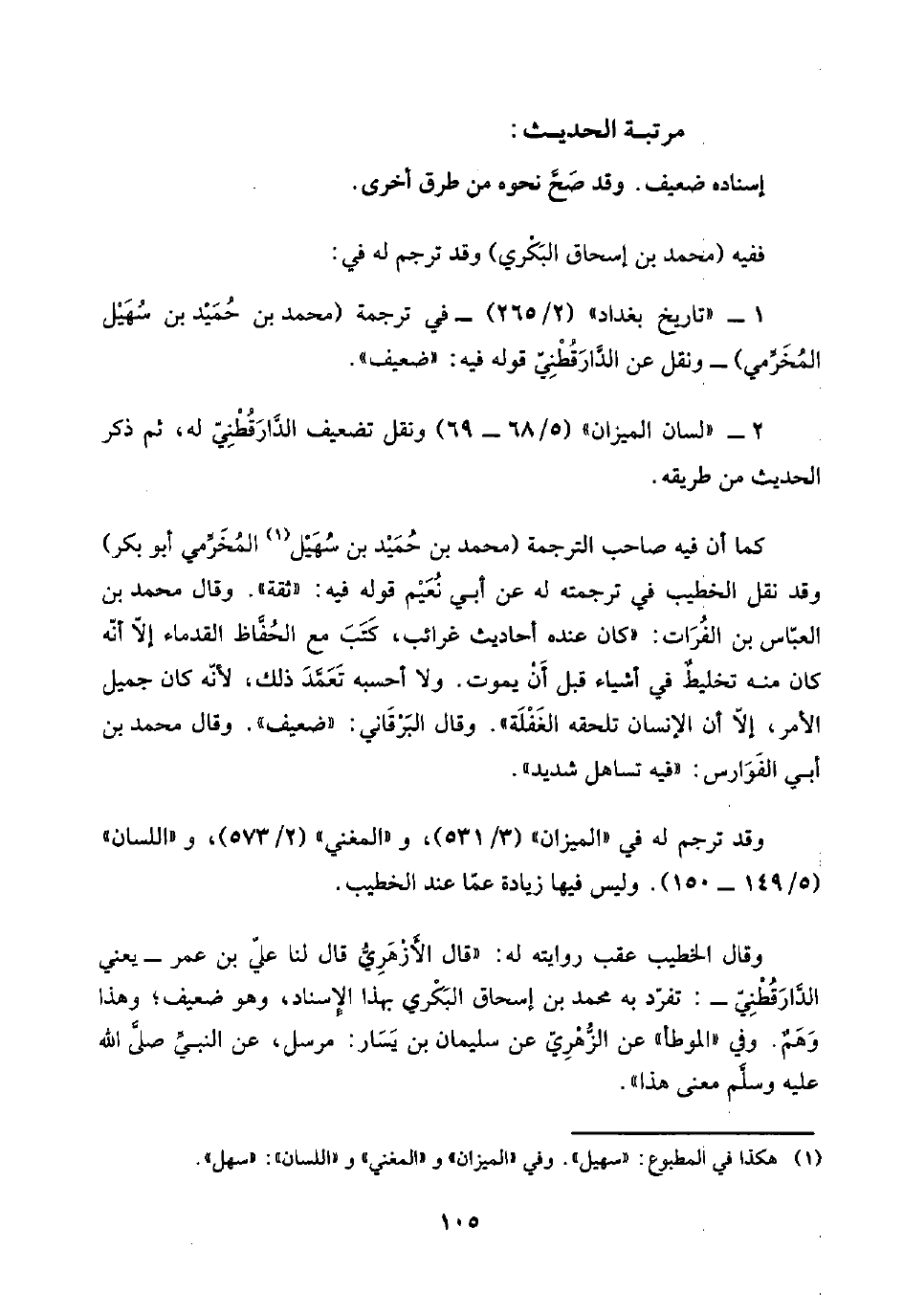 ١ - "تاريخ بغداد" (٢/ ٢٦٥) -في ترجمة (محمد بن حُمَيْد بن سُهَيْل المُخَرِّمي) - ونقل عن الدَّارَقُطْنِيّ قوله فيه: "ضعيف".