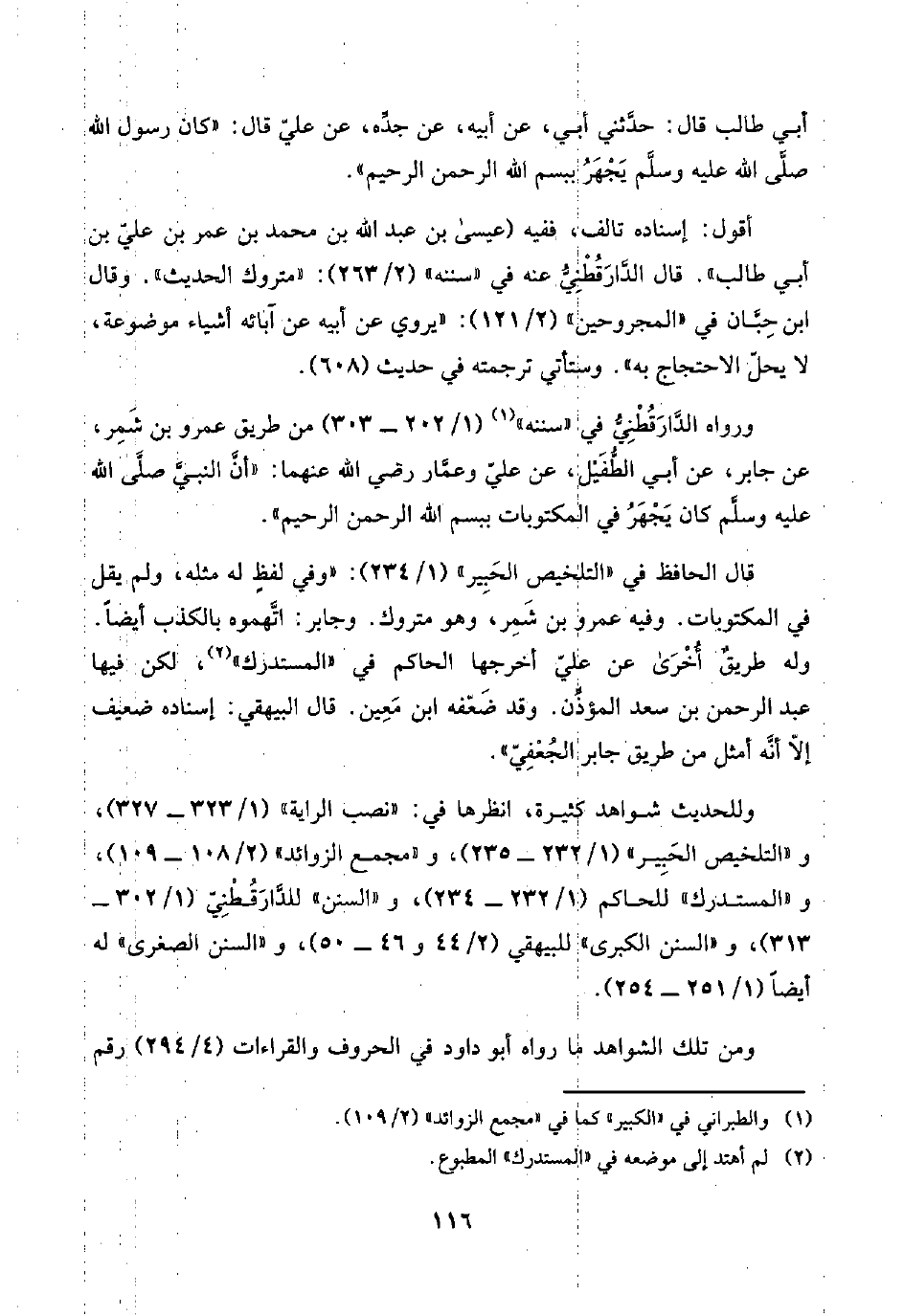 أبي طالب قال: حدَّثني أبي، عن أبيه، عن جدِّه، عن عليّ قال: "كان رسول اللَّه صلَّى اللَّه عليه وسلَّم يَجْهَرُ ببسم اللَّه الرحمن الرحيم".