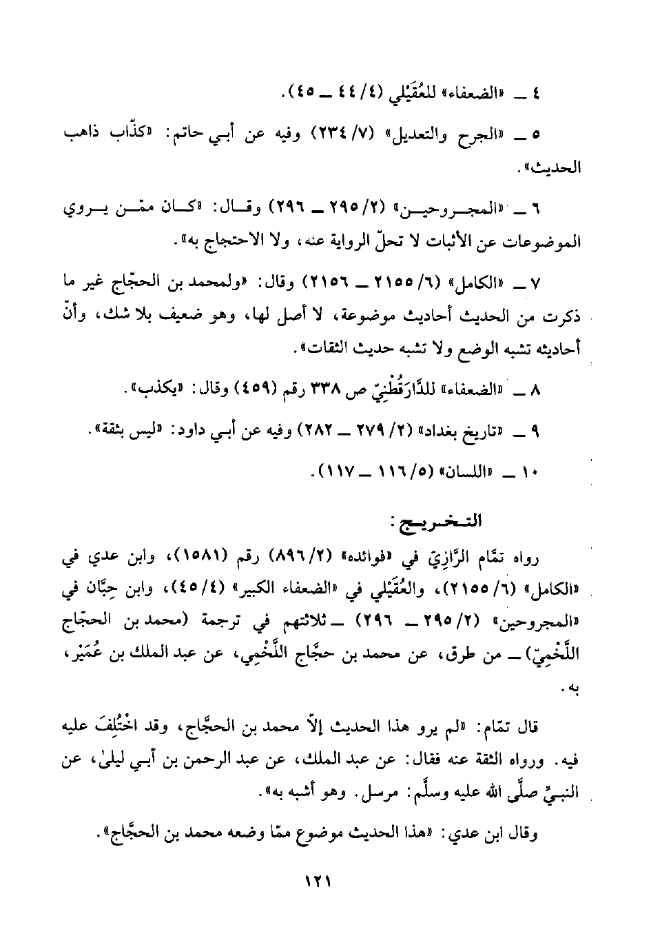 ٧ - "الكامل" (٦/ ٢١٥٥ - ٢١٥٦) وقال: "ولمحمد بن الحجّاج غير ما ذكرت من الحديث أحاديث موضوعة، لا أصل لها، وهو ضعيف بلا شك، وأنّ أحاديثه تشبه الوضع ولا تشبه حديث الثقات".