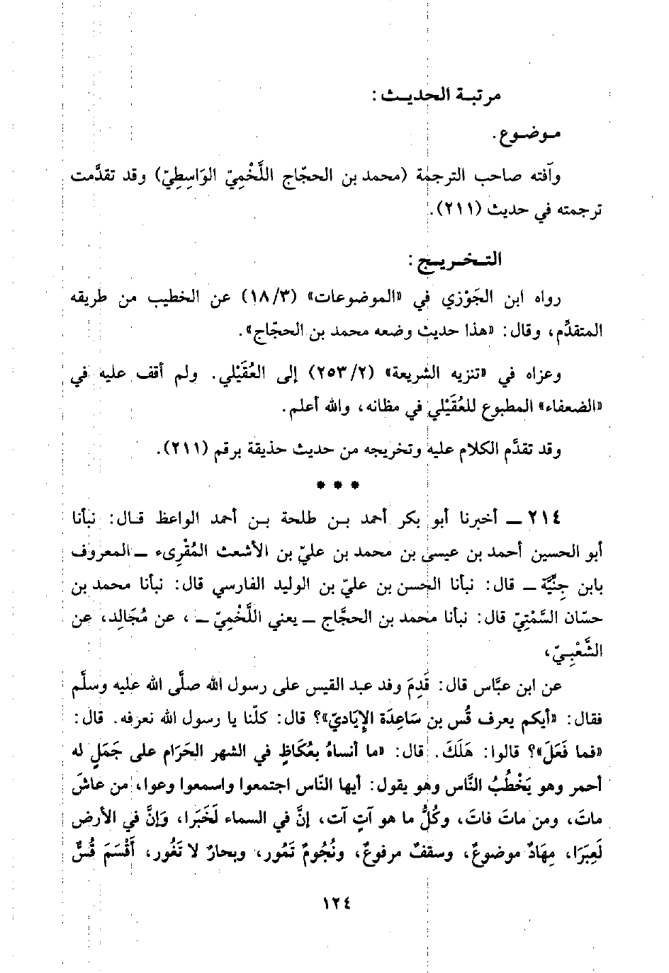 ٢١٤ - أخبرنا أبو بكر أحمد بن طلحة بن أحمد الواعظ قال: نبأنا أبو الحسين أحمد بن عيسى بن محمد بن عليّ بن الأشعث المُقْرِيء -المعروف بابن جِنِّيَّة - قال: نبأنا الحسن بن عليّ بن الوليد الفارسي قال: نبأنا محمد بن حسّان السَّمْتِيّ قال: نبأنا محمد بن الحجَّاج -يعني اللَّخْمِيّ-، عن مُجَالِد، عن الشَّعْبِيّ،