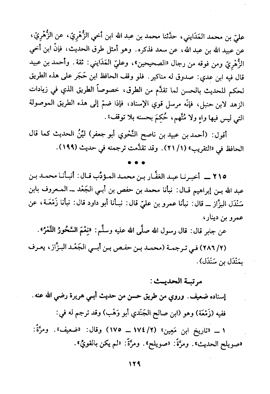 عليّ بن محمد المَدَايني، حدَّثنا محمد بن عبد اللَّه ابن أخي الزُّهْرِيّ، عن الزُّهْرِيّ، عن عبيد اللَّه بن عبد اللَّه، عن سعد فذكره. وهو أمثل طرق الحديث، فإنّ ابن أخي الزُّهْرِيّ ومن فوقه من رجال "الصحيحين"، وعلىّ المَدَايني: ثقة. وأحمد بن عبيد قال فيه ابن عدي: صدوق له مناكير. فلو وقف الحافظ ابن حَجَر على هذه الطريق الحكم للحديث بالحسن لما تقدَّم من الطرق، خصوصًا الطريق الذي في زيادات الزهد لابن حنبل، فإنّه مرسل قوي الإسناد، فإذا ضمّ إلى هذه الطريق الموصولة التي ليس فيها واهٍ ولا مُتَّهم، حُكِمَ بحسنه بلا توقف".