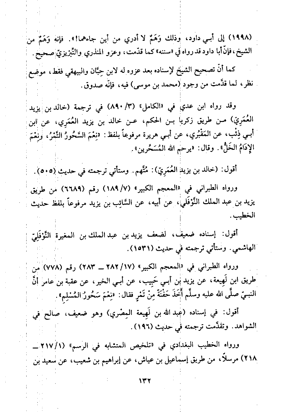 وقد رواه ابن عدي في "الكامل" (٣/ ٨٩٠) في ترجمة (خالد بن يزيد العُمَرِيّ) من طريق زكريا بن الحكم، عن خالد بن يزيد العُمَرِي، عن ابن أبي ذِئْب، عن المَقْبُري، عن أبي هريرة مرفوعًا بلفظ: "نِعْمَ السَّحُورُ التَّمْرُ، ونِعْمَ الإدَامُ الخَلُّ". وقال: "يرحم اللَّه المُسَحِّرين".