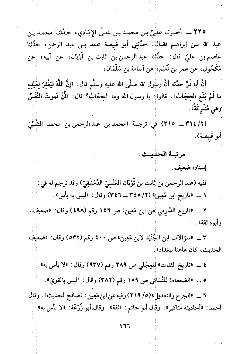 ٢٢٥ - أخبرنا عليّ بن محمد بن عليّ الإِيَادي، حدَّثنا محمد بن عبد اللَّه بن إبراهيم فقال: حدَّثنِي أبو قَبِيصة محمد بن عبد الرحمن، حدَّثنا عاصم بن عليّ قال: حدَّثنا عبد الرحمن بن ثابت بن ثَوْبَان، عن أبيه، عن مَكْحُول، عن عمر بن نُعَيْم، عن أسامة بن سَلْمَان،