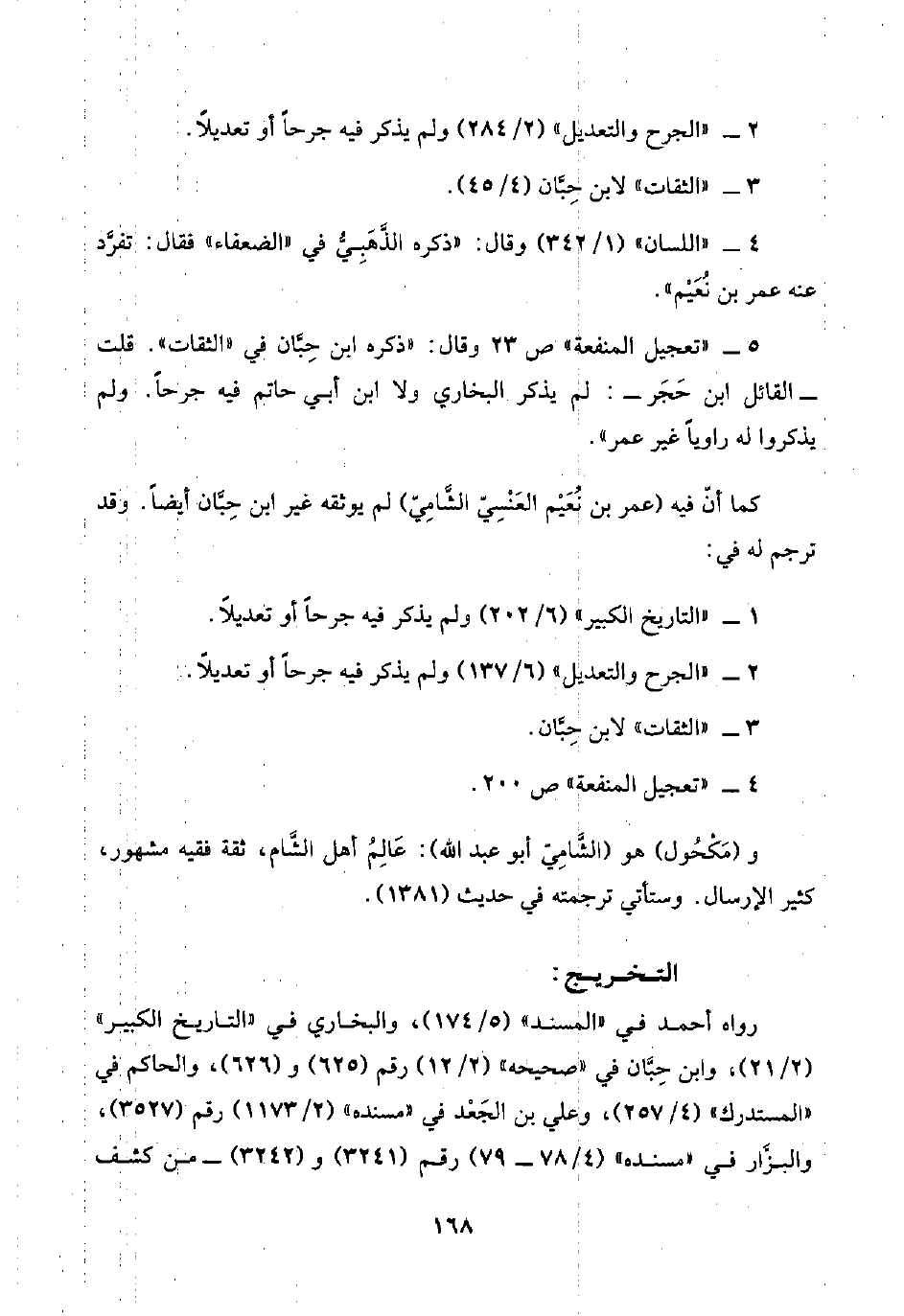 كما أنَّ فيه (عمر بن نُعَيْم العَنْسِيّ الشَّامِيّ) لم يوثقه غير ابن حِبَّان أيضًا. وقد ترجم له في: